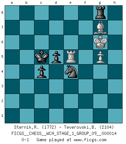 Last move : 0-1 2015 February 3 22:15:35 [Event "FICGS__CHESS__WCH_STAGE_1_GROUP_09__000014"] [Site "FICGS"] [Date "2014.11.01"] [Round "1"] [White "Sternik,Ryszard"] [Black "Teverovski,Bogoljub"] [Result "0-1"] [WhiteElo "1772"] [BlackElo "2104"] 1.e4 c5 2.Nf3 Nc6 3.d4 cxd4 4.Nxd4 e6 5.c4 Nf6 6.Nc3 Bb4 7.Nxc6 bxc6 8.Bd3 e5 9.Be3 d6 10.Qa4 Bxc3+ 11.bxc3 O-O 12.O-O c5 13.Rab1 Qc7 14.Rb3 Bd7 15.Qa6 Bc6 16.f3 Nd7 17.Qa3 Nb6 18.Rfb1 f6 19.Qa6 Bd7 20.Bf1 f5 21.exf5 Bxf5 22.Re1 Qf7 23.Rb2 Bc8 24.Qb5 Be6 25.Qc6 Bxc4 26.Bxc4 Nxc4 27.Rb7 Qe6 28.Qa6 Qd5 29.Bf2 h5 30.a4 Rfb8 31.Rxb8+ Rxb8 32.Qxa7 Qb7 33.Qxb7 Rxb7 34.Ra1 Kf7 35.Kf1 Ra7 36.Ke2 Ke6 37.g4 hxg4 38.fxg4 Kd5 39.Kf3 e4+ 40.Ke2 e3 41.Bxe3 Re7 42.Rd1+ Kc6 43.Rd3 Re8 44.h3 Nb2 45.Rd2 Nxa4 46.c4 Nb6 47.Rc2 Rh8 48.Rc1 Rxh3 49.Bf4 Rh4 50.Kf3 Rh8 51.Bd2 g6 52.Kf4 Ra8 53.Kg5 Ra4 54.Bf4 Nxc4 55.Rb1 Ra8 56.Kxg6 Rf8 57.Bg3 Nd2 58.Re1 d5 59.Re6+ Kb5 60.g5 Ne4 61.Be5 Rg8+ 62.Bg7 c4 63.Re5 Kc5 0-1 Sicilian defense Kingside Castling by player Black (move 11) Kingside Castling by player White (move 12) 10 pieces endgame at move 54 : White KRBP , Black KRNPPP WHITE : King + 1 Rook 1 Bishop 1 Pawn BLACK : King + 1 Rook 1 Knight 3 Pawns 9 pieces endgame at move 56 : White KRBP , Black KRNPP WHITE : King + 1 Rook 1 Bishop 1 Pawn BLACK : King + 1 Rook 1 Knight 2 Pawns Player Black won this chess game. Follow this game move after move (download)Chess is as much a mystery as women. (Purdy) Der 70jährige Viktor Kortschnoi: Die Rentenanstalt wollte mich zwingen in Rente zu gehen. Meine Frau erhält jetzt eine Pension- und ich zahle weiter in die Rentenkasse ein! (Viktor Kortschnoi) Siempre es mejor sacrificar los hombres de tu oponente. (Savielly Tartakower) Toute estimation doit être constamment réévaluée. (Jacob Estrin) He who fights with monsters should be careful lest he thereby become a monster. (Friedrich Nietzsche, Beyond Good and Evil)