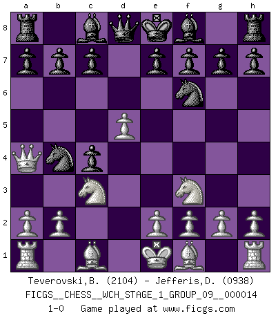 Last move : 1-0 2014 November 12 21:35:45 [Event "FICGS__CHESS__WCH_STAGE_1_GROUP_09__000014"] [Site "FICGS"] [Date "2014.11.01"] [Round "1"] [White "Teverovski,Bogoljub"] [Black "Jefferis,Des"] [Result "1-0"] [WhiteElo "2104"] [BlackElo "0938"] 1.Nf3 Nc6 2.d4 d5 3.c4 dxc4 4.Nc3 Nf6 5.d5 Nb4 6.Qa4+ 1-0 Reti Opening Player White won this chess game. Follow this game move after move (download)When you play Bobby, it is not a question if you win or lose. It is a question if you survive. (Boris Spassky) Der Vorposten provoziert a) eine Basis für neue Angriffe und b) eine Schwächung der gegnerischen Widerstandskraft in der fraglichen Linie. (Aaron Nimzowitsch) Todos los jugadores de Ajedrez deberían tener un pasatiempo. (Savielly Tartakower) Mais l'homme est une créature légère et illogique : semblable au joueur d'échecs, il n'aime que le processus du but à atteindre, non le but lui-même. (Dostoïevsky) He who defends everything defends nothing. (Frederick the Great)