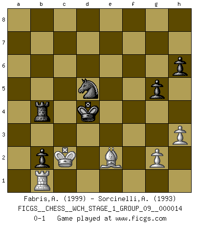 Last move : 0-1 2015 April 26 7:48:54 [Event "FICGS__CHESS__WCH_STAGE_1_GROUP_09__000014"] [Site "FICGS"] [Date "2014.11.01"] [Round "1"] [White "Fabris,Alberto"] [Black "Sorcinelli,Andrea"] [Result "0-1"] [WhiteElo "1999"] [BlackElo "1993"] 1.d4 Nf6 2.c4 e6 3.Nc3 Bb4 4.Qc2 O-O 5.e4 d6 6.a3 Bxc3+ 7.bxc3 e5 8.Bd3 Nc6 9.Ne2 h6 10.O-O b6 11.f4 Na5 12.Ng3 c5 13.d5 Ng4 14.h3 exf4 15.Bxf4 Ne5 16.Qe2 Qf6 17.Rae1 Re8 18.Bxe5 Qxe5 19.Qf2 f6 20.Re3 Bd7 21.Ne2 Re7 22.Nf4 Be8 23.Qd2 Bf7 24.Rg3 Be8 25.Rg4 g5 26.Ne6 Bg6 27.Qf2 Rxe6 28.dxe6 Kg7 29.Rg3 Nc6 30.Be2 Qxe6 31.Bg4 Qe7 32.Bf5 Bf7 33.Rd1 Ne5 34.Re3 Bxc4 35.Qg3 a5 36.R3e1 b5 37.Bg4 b4 38.cxb4 axb4 39.axb4 cxb4 40.Be2 Bf7 41.Rd2 b3 42.Red1 Ra4 43.Qe3 Rb4 44.Bf1 Qc7 45.Rxd6 b2 46.Qf2 f5 47.Qxf5 Qe7 48.R6d5 Bxd5 49.exd5 Qf6 50.Qxf6 Kxf6 51.Rb1 Ng6 52.Kf2 Nf4 53.Ke3 Ke5 54.d6 Kxd6 55.Kd2 Ke5 56.Kc2 Nd5 57.Be2 Kd4 0-1 Nimzo-Indian : Classical variation Kingside Castling by player Black (move 4) Kingside Castling by player White (move 10) Player Black won this chess game. Follow this game move after move (download)Openings teach you openings. Endgames teach you chess ! (Stephan Gerzadowicz) Der zweitbeste Zug ist oft der einzig richtige. (Savielly Grigorievitsch Tartakower) La estratégia requiere pensar, la táctica requiere observación. (Max Euwe) Si rien de grave n'est détecté lors de l'analyse d'une position, on joue alors le coup. Seconde règle de Blumenfeld. Convictions are more dangerous enemies of truth than lies. (Friedrich Nietzsche)
