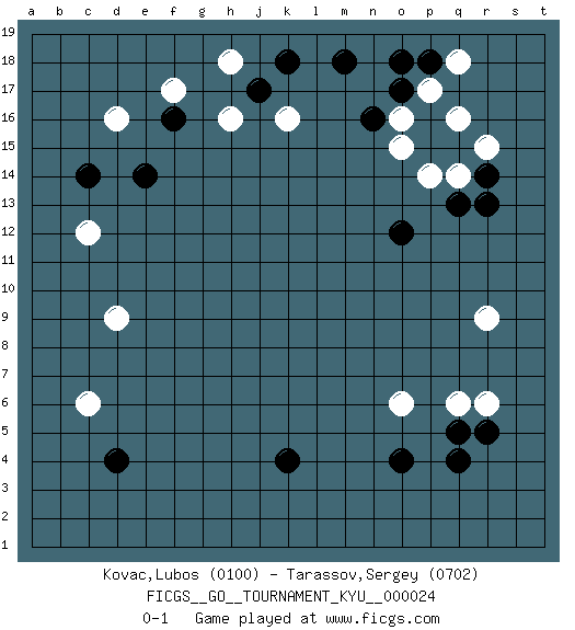 Last move : 0-1 2007 April 23 12:29:21 [Event "FICGS__GO__TOURNAMENT_KYU__000024 "] [Site "FICGS"] [Date "2007.02.25"] [Round "1"] [Black "Kovac,Lubos "] [White "Tarassov,Sergey "] [Result "0-1"] [Rating 1 "0100"] [Rating 2 "0702"] 1.d4 q16 2.q4 d16 3.r14 q14 4.q13 p14 5.r13 r15 6.o12 k16 7.o17 p17 8.p18 q18 9.o18 o16 10.n16 o15 11.m18 q6 12.o4 r9 13.k18 h18 14.r5 r6 15.q5 o6 16.c14 c12 17.e14 d9 18.f16 f17 19.j17 h16 20.k4 c6 0-1 This go game has been lost on time (started : 2007.02.25 18:37:12) Here are the names of the openings (joseki) played in the four corners : Corner q16 : q16 r14Hoshi (Hwajeom, Seongjeom, Xingwei`) 4-4 Point. The star or hoshi (4-4) point, emphasizing influence at the potential expense of territory.Ikken Kakari (Hankan Keolch'im, Yi Gua`jiao~, 1-Space Low Approach). Black 2 is the standard approach move to the 4-4. Corner q4 : q4 q6Hoshi (Hwajeom, Seongjeom, Xingwei`) 4-4 Point. The star or hoshi (4-4) point, emphasizing influence at the potential expense of territory.Ikken Takagakari (Hankan Nop'dakeolch'im, Yi Gaojia, 1-Space High Approach). Black typically responds at 6-4 or 3-10. Black 4-10 is played when Black finds play on the right side advantageous. Black 4-8 or 3-8 may be played when Black has support at top. Corner d4 : d4 d9Hoshi (Hwajeom, Seongjeom, Xingwei`) 4-4 Point. The star or hoshi (4-4) point, emphasizing influence at the potential expense of territory. Player White won this Go (weiqi, baduk) game.Follow this game move after move (download ) One point in the center is worth ten in the corner. (Anonymous) However beautiful the strategy, you should occasionally look at the results. (Winston Churchill)