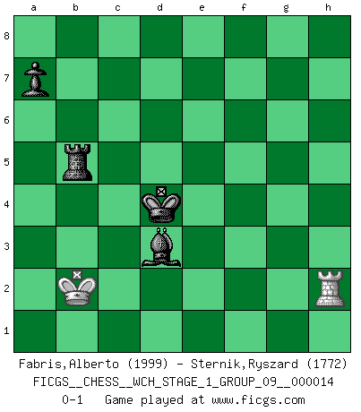 Last move : 0-1 2015 March 26 15:13:42 [Event "FICGS__CHESS__WCH_STAGE_1_GROUP_09__000014"] [Site "FICGS"] [Date "2014.11.01"] [Round "1"] [White "Fabris,Alberto"] [Black "Sternik,Ryszard"] [Result "0-1"] [WhiteElo "1999"] [BlackElo "1772"] 1.d4 d5 2.Nf3 Nf6 3.c4 c6 4.Qc2 e6 5.a3 dxc4 6.Qxc4 Nbd7 7.Nc3 Nb6 8.Qd3 c5 9.e4 cxd4 10.Nxd4 Be7 11.Bf4 O-O 12.Be2 Nfd7 13.e5 Nc5 14.Qe3 Bd7 15.O-O Nca4 16.Qg3 Nxc3 17.bxc3 Bh4 18.Qh3 Be7 19.Bd3 g6 20.Qg3 Rc8 21.Rfc1 Nc4 22.Rcb1 b6 23.a4 Rc5 24.Nb3 Rc8 25.Nd2 Bh4 26.Qh3 Nxd2 27.Bxd2 Bg5 28.f4 Be7 29.Be1 Qc7 30.Rd1 Rfd8 31.Ba6 Rb8 32.Rd3 Qc5+ 33.Bf2 Qa5 34.Bc4 Be8 35.Bd4 Rbc8 36.Bxe6 fxe6 37.Qxe6 Kf8 38.Qh3 Kg7 39.Qe6 Rc7 40.f5 gxf5 41.Rg3 Bg6 42.Qxf5 Rf8 43.e6 Bf6 44.Qxa5 bxa5 45.Rd1 Re8 46.h4 Bxd4+ 47.cxd4 Kf6 48.d5 Rc4 49.Re1 Rf4 50.Rc3 Rd4 51.h5 Bxh5 52.Rc5 Bg6 53.Rxa5 Re7 54.Re2 h5 55.Kh2 Be4 56.d6 Rxe6 57.Rxh5 Rexd6 58.a5 R6d5 59.Rh4 Bf5 60.Rxd4 Rxd4 61.Ra2 Ke5 62.Kg3 Be6 63.Re2 Kd6 64.Rb2 Ra4 65.Rb5 Bd5 66.Kf2 Ra2+ 67.Ke3 Rxg2 68.Kd3 Rg4 69.Kc3 Ra4 70.Kb2 Kc6 71.Rb8 Kc5 72.Rc8 Kd4 73.Rd8 Ra2+ 74.Kb1 Rxa5 75.Rh8 Bc4 76.Rh2 Bd3+ 77.Kb2 Rb5+ 0-1 This chess game has been lost on time (started : 2014.11.01 21:28:12) Queen's pawn game Kingside Castling by player Black (move 11) Kingside Castling by player White (move 15) 10 pieces endgame at move 57 : White KRRPP , Black KRRBP WHITE : King + 2 Rooks 2 Pawns BLACK : King + 2 Rooks 1 Bishop 1 Pawn 9 pieces endgame at move 60 : White KRRPP , Black KRBP WHITE : King + 2 Rooks 2 Pawns BLACK : King + 1 Rook 1 Bishop 1 Pawn 8 pieces endgame at move 60 : White KRPP , Black KRBP WHITE : King + 1 Rook 2 Pawns BLACK : King + 1 Rook 1 Bishop 1 Pawn 7 pieces endgame at move 67 : White KRP , Black KRBP WHITE : King + 1 Rook 1 Pawn BLACK : King + 1 Rook 1 Bishop 1 Pawn 6 pieces endgame at move 74 : White KR , Black KRBP WHITE : King + 1 Rook BLACK : King + 1 Rook 1 Bishop 1 Pawn Player Black won this chess game. Follow this game move after move (download)Spassky will not be psyched out by Fischer. (Mike Goodall) Alles was ich jemals tun will ist Schach spielen. (Robert James Fischer) No existe un remordimiento como el remordimiento del Ajedrez. (H. G. Wells) La menace est plus forte que l'exécution. (Aaron Nimzovitch) There are two major products that came out of Berkeley: LSD and UNIX. We do not believe this is to be a coincidence. (Jeremy S. Anderson)