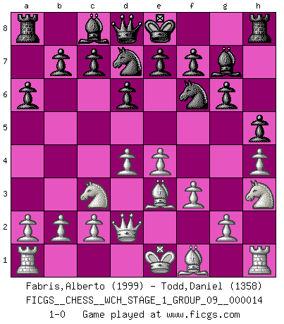 Last move : 1-0 2014 December 13 1:36:15 [Event "FICGS__CHESS__WCH_STAGE_1_GROUP_09__000014"] [Site "FICGS"] [Date "2014.11.01"] [Round "1"] [White "Fabris,Alberto"] [Black "Todd,Daniel"] [Result "1-0"] [WhiteElo "1999"] [BlackElo "1358"] 1.d4 g6 2.e4 Bg7 3.Nc3 d6 4.Be3 a6 5.Qd2 Nd7 6.h4 h5 7.Nh3 Ngf6 8.f3 1-0 This chess game has been lost on time (started : 2014.11.01 21:28:12) Modern defense Player White won this chess game. Follow this game move after move (download)The tactician must know what to do whenever something needs doing; the strategist must know what to do when nothing needs doing. (Savielly Tartakover) Gegen einen Schachcomputer zu verlieren ist wie Löcher in den Strümpfen zuhaben. Es ist nicht peinlich, solange man der einzige ist der es weiß. (Anonymous) El arma más poderosa en el Ajedrez, es tener la próxima movida. (David Bronstein) Les Echecs mettent en conflit, non pas deux intelligences, mais deux volontés. (Lasker) If we knew what we were doing, we would not call it research. (Albert Einstein)