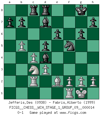 Last move : 0-1 2014 November 30 9:54:19 [Event "FICGS__CHESS__WCH_STAGE_1_GROUP_09__000014"] [Site "FICGS"] [Date "2014.11.01"] [Round "1"] [White "Jefferis,Des"] [Black "Fabris,Alberto"] [Result "0-1"] [WhiteElo "0938"] [BlackElo "1999"] 1.e4 c5 2.c4 Nc6 3.Nc3 g6 4.d3 Bg7 5.Qd2 e6 6.Nf3 Nge7 7.a3 O-O 8.Be2 d5 9.b3 Qa5 10.Bb2 Rd8 11.Na4 Bxb2 12.Qxa5 Nxa5 13.Ra2 Bg7 14.b4 cxb4 15.axb4 Nac6 16.b5 Nd4 17.Nxd4 Bxd4 18.O-O f5 19.exf5 Nxf5 20.Rc2 Bd7 21.Nc3 Rac8 0-1 Sicilian defense Kingside Castling by player Black (move 7) Kingside Castling by player White (move 18) Player Black won this chess game. Follow this game move after move (download)Not only will I predict his triumph over Botvinnik, but I'll go further and say that he'll probably be the greatest Chess player that ever lived. (John Collins) Habe Mut, dich deines eigenen Verstandes zu bedienen. (Immanuel Kant) El Ajedrez tiene tanto misterio como las mujeres. (Purdy) Echiquier : carré parfait, comme la Jérusalem nouvelle décrite par l'auteur de l'Apocalypse, huit cases sur huit, exaltation du chiffre 4, symbole du cosmos aux quatre horizons... où le noir et le blanc, l'ombre et la lumière, le mal et le bien s'entremêlent et se conjuguent. (Robert Couffignal, Le Gambit du poète) . 'gn is not allowed in chess unless n is an integer between 1 and 8 inclusive, where 1 and 8 are to interpreted as the standard numerals standing for integers in the ordered real-closed field R, with the *canonical* ordering. (As opposed to, say, an integer in the domain Z[2+i*sqrt(5)] or an integer in some exotic Grothendieck topos). (Normajean Yates)