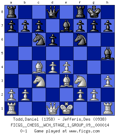 Last move : 0-1 2014 December 19 2:10:36 [Event "FICGS__CHESS__WCH_STAGE_1_GROUP_09__000014"] [Site "FICGS"] [Date "2014.11.01"] [Round "1"] [White "Todd,Daniel"] [Black "Jefferis,Des"] [Result "0-1"] [WhiteElo "1358"] [BlackElo "0938"] 1.e4 e5 2.Nf3 Nc6 3.Bc4 Be7 4.d4 exd4 5.c3 d6 6.cxd4 Nf6 7.Nc3 Bg4 8.Be3 O-O 9.h3 Bh5 0-1 This chess game has been lost on time (started : 2014.11.01 21:28:12) Hungarian defense Kingside Castling by player Black (move 8) Player Black won this chess game. Follow this game move after move (download)Later, I began to succeed in decisive games. Perhaps because I realized a very simple truth: not only was I worried, but also my opponent. (Mikhail Tal) Stil? Ich habe keinen Stil! (Anatoly Karpov) El Ajedrez, como cualquier actividad creativa, solo puede existir a través del esfuerzo combinado de aquellos que tienen talento creativo y de aquellos que poseen la habilidad de organizar su trabajo creativo. (Mikhail Botvinnik) Karpov est une pièce de musée. (Garry Kasparov) Go and wake up your luck. (Persian saying)