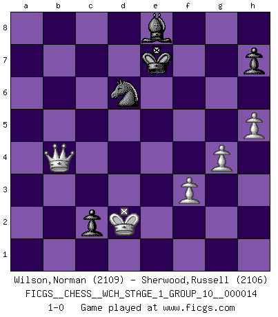 Last move : 1-0 2015 January 21 21:14:15 [Event "FICGS__CHESS__WCH_STAGE_1_GROUP_10__000014"] [Site "FICGS"] [Date "2014.11.01"] [Round "1"] [White "Wilson,Norman"] [Black "Sherwood,Russell"] [Result "1-0"] [WhiteElo "2109"] [BlackElo "2106"] 1.c4 e5 2.Nc3 Nf6 3.Nf3 Nc6 4.g3 d5 5.cxd5 Nxd5 6.Bg2 Nb6 7.O-O Be7 8.a3 O-O 9.b4 Be6 10.Rb1 f6 11.d3 a5 12.bxa5 Rxa5 13.Nb5 Qd7 14.Be3 Ra6 15.Qc2 Rfa8 16.Rfc1 Nd5 17.Bc5 Bxc5 18.Qxc5 Rc8 19.e4 Nb6 20.Bf1 R6a8 21.d4 exd4 22.Rd1 Bg4 23.Nbxd4 Re8 24.Qc2 Nxd4 25.Rxd4 Qe7 26.Rdb4 Rxa3 27.Nd4 Ra5 28.Nb5 c5 29.R4b3 Nc8 30.Na3 Ra7 31.Re3 Bh5 32.Nb5 Ra5 33.e5 fxe5 34.Rbe1 b6 35.Bc4+ Kh8 36.Qc3 e4 37.Rxe4 Qxe4 38.Rxe4 Rxe4 39.f3 Re7 40.Qd2 Re8 41.Nc7 Rf8 42.g4 Ra4 43.Ne6 Rxc4 44.Nxf8 Rd4 45.Qg5 Bg6 46.Kf2 c4 47.h4 Kg8 48.Ne6 Rd6 49.Qe5 Kf7 50.Nxg7 c3 51.Nf5 c2 52.Nxd6+ Nxd6 53.Qf4+ Ke7 54.Ke2 b5 55.h5 Be8 56.Kd2 b4 57.Qxb4 1-0 A. T. S. Broekhuizen Reversed Sicilian is always hard for black it seems. English Opening Kingside Castling by player White (move 7) Kingside Castling by player Black (move 8) 10 pieces endgame at move 57 : White KQPPP , Black KBNPP WHITE : King + 1 Queen 3 Pawns BLACK : King + 1 Bishop 1 Knight 2 Pawns Player White won this chess game. Follow this game move after move (download)I like the moment when I break a man's ego. (Bobby Fischer) Unter Putin wird alles Geld aus Russland wie von einem Staubsauger nach Moskau umgeleitet, das ist wie ein schwarzes Loch. (Garry Kasparov) Los finales de Peón son del Ajedrez lo que el cesped es del Golf. (Cecil Purdy) Le jeu d'échecs fait naître et fortifie en nous plusieurs qualités précieuses dans le cours de l'existence, telles que la prévoyance, la circonspection, la prudence, et la persévérance. (Benjamin Franklin - 1783, la morale des échecs) Perhaps the current trend of many chess professionals taking up the more lucrative pastime of poker is not a wholly negative one. It may not be too late for humans to relearn how to take risks in order to innovate and thereby maintain the advanced lifestyles we enjoy. And if it takes a poker-playing supercomputer to remind us that we can't enjoy the rewards without taking the risks, so be it. (The Chess Master and the Computer, by Garry Kasparov - 2010)