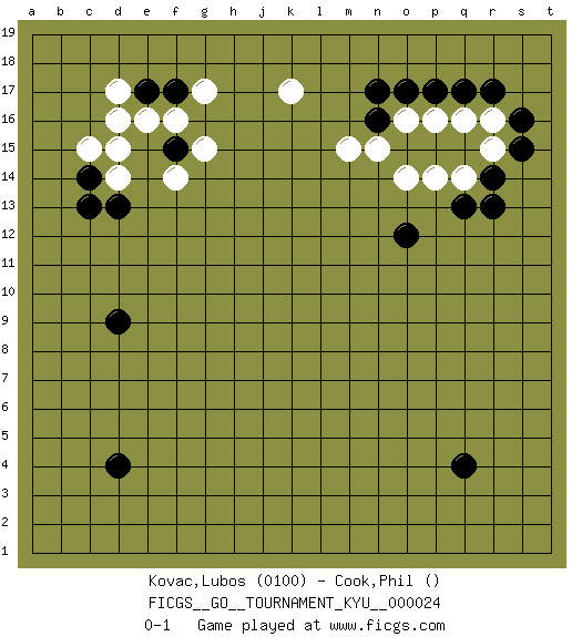 Last move : 0-1 2007 May 5 1:45:58 [Event "FICGS__GO__TOURNAMENT_KYU__000024"] [Site "FICGS"] [Date "2007.02.25"] [Round "1"] [Black "Kovac,Lubos"] [White "Cook,Phil"] [Result "0-1"] [Rating 1 "0100"] 1.d4 d16 2.q4 q16 3.c14 d14 4.d13 c15 5.c13 d15 6.o17 k17 7.r14 q14 8.f17 g17 9.f15 f16 10.e17 e16 11.q13 r15 12.r13 o16 13.n17 d17 14.p17 p16 15.r17 g15 16.n16 n15 17.q17 p14 18.o12 o14 19.d9 f14 20.s15 r16 21.s16 m15 0-1 This go game has been lost on time (started : 2007.02.25 18:37:12) Here are the names of the openings (joseki) played in the four corners : Corner d16 : d16 c14 Hoshi (Hwajeom, Seongjeom, Xingwei`) 4-4 Point. The star or hoshi (4-4) point, emphasizing influence at the potential expense of territory. Ikken Kakari (Hankan Keolch'im, Yi Gua`jiao~, 1-Space Low Approach). Black 2 is the standard approach move to the 4-4. Corner q16 : q16 o17 Hoshi (Hwajeom, Seongjeom, Xingwei`) 4-4 Point. The star or hoshi (4-4) point, emphasizing influence at the potential expense of territory. Ikken Kakari (Hankan Keolch'im, Yi Gua`jiao~, 1-Space Low Approach). Black 2 is the standard approach move to the 4-4. Player White won this Go (weiqi, baduk) game. Follow this game move after move (download)Big groups never die. (Anonymous) In God we trust, all others we virus scan. (Anonymous)