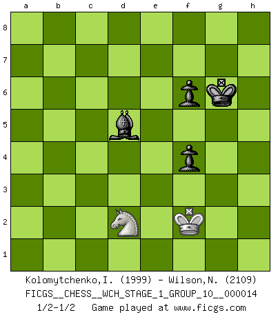 Last move : 1/2-1/2 2015 March 2 10:5:16 [Event "FICGS__CHESS__WCH_STAGE_1_GROUP_10__000014"] [Site "FICGS"] [Date "2014.11.01"] [Round "1"] [White "Kolomytchenko,Igor"] [Black "Wilson,Norman"] [Result "1/2-1/2"] [WhiteElo "1999"] [BlackElo "2109"] 1.e4 c6 2.d4 d5 3.exd5 cxd5 4.Nf3 Nc6 5.c4 Nf6 6.Nc3 g6 7.cxd5 Nxd5 8.Qb3 e6 9.Bg5 Be7 10.Bh6 Bf8 11.Bxf8 Kxf8 12.Bb5 Na5 13.Qa3+ Kg7 14.O-O b6 15.b4 a6 16.Bd3 Qd6 17.Qb2 Qxb4 18.Qxb4 Nxb4 19.Be4 Nbc6 20.Na4 b5 21.Nc5 Ra7 22.Rac1 Rd8 23.Rfd1 Rc7 24.a4 Nc4 25.axb5 axb5 26.Rb1 Na7 27.h3 e5 28.Ra1 Nc6 29.Nb3 Nxd4 30.Nfxd4 exd4 31.Rxd4 Rd6 32.f4 Be6 33.Kf2 h5 34.Bd3 Rb6 35.Rc1 Rc8 36.Rc2 h4 37.f5 gxf5 38.Rxh4 Ne5 39.Rxc8 Nxd3+ 40.Ke2 Bxc8 41.Kxd3 Rg6 42.Rb4 Rxg2 43.Nc5 Rh2 44.Rxb5 Kf6 45.Ra5 Rxh3+ 46.Kd2 Be6 47.Ra4 Rh8 48.Ke3 Kg5 49.Nd3 Re8 50.Kf2 Rc8 51.Ra3 Rd8 52.Kf3 Rd4 53.Ke3 Re4+ 54.Kf3 Bc4 55.Nf2 Be2+ 56.Kg2 Rc4 57.Nh3+ Kg4 58.Nf2+ Kh4 59.Nd3 f4 60.Ne1 Rb4 61.Nf3+ Kh5 62.Ne5 f6 63.Nd3 Rd4 64.Ra5+ Kh6 65.Ne1 Rd2 66.Nf3 Rb2 67.Rd5 Bc4 68.Rd2 Rxd2+ 69.Nxd2 Bd5+ 70.Kf2 Kg6 1/2-1/2 Caro-Kann : Exchange variation Kingside Castling by player White (move 14) 10 pieces endgame at move 42 : White KRNP , Black KRBPPP WHITE : King + 1 Rook 1 Knight 1 Pawn BLACK : King + 1 Rook 1 Bishop 3 Pawns 9 pieces endgame at move 44 : White KRNP , Black KRBPP WHITE : King + 1 Rook 1 Knight 1 Pawn BLACK : King + 1 Rook 1 Bishop 2 Pawns 8 pieces endgame at move 45 : White KRN , Black KRBPP WHITE : King + 1 Rook 1 Knight BLACK : King + 1 Rook 1 Bishop 2 Pawns 7 pieces endgame at move 68 : White KN , Black KRBPP WHITE : King + 1 Knight BLACK : King + 1 Rook 1 Bishop 2 Pawns 6 pieces endgame at move 69 : White KN , Black KBPP WHITE : King + 1 Knight BLACK : King + 1 Bishop 2 Pawns This chess game ended in a draw. Follow this game move after move (download)Chess is like life. (Boris Spassky) Ein typischer, sehr verbreiteter Gedankenschädling ist der, daß der betreffende Amateur von der Annanhme ausgeht, daß jeder einzelne Zug etwas zu leisten habe. (Aaron Nimzowitsch) Solo el jugador con la iniciativa tiene el derecho a atacar. (Wilhelm Steinitz) L'action d'une oeuvre littéraire se déroule sur un champ de bataille. Les masques et les types du drame moderne correspondent aux pièces du jeu d'échecs. L'intrigue correspond aux coups et aux gambits, c'est à dire aux techniques du jeu telles qu'utilisées et interprétées par les joueurs. Les tactiques et les péripéties [mouvements] correspondent aux coups exécutés par l'adversaire. (Viktor Shklovsky) Macintosh - we might not get everything right, but at least we knew the century was going to end. (Douglas Adams)