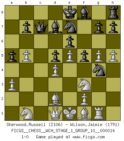 Last move : 1-0 2015 January 19 17:22:41 [Event "FICGS__CHESS__WCH_STAGE_1_GROUP_10__000014"] [Site "FICGS"] [Date "2014.11.01"] [Round "1"] [White "Sherwood,Russell"] [Black "Wilson,Jaimie"] [Result "1-0"] [WhiteElo "2106"] [BlackElo "1791"] 1.e4 e6 2.d4 d5 3.e5 c5 4.c3 Qb6 5.Nf3 Nc6 6.a3 Nh6 7.b4 cxd4 8.cxd4 Nf5 9.Bb2 Bd7 10.g4 Nh6 11.Rg1 Rc8 12.Nbd2 a5 13.b5 Ne7 14.h4 Ng6 15.Rc1 f5 16.g5 Ng4 17.Rxc8+ Bxc8 18.Nb1 Bd7 19.Bc1 Qc7 20.h5 Ne7 21.Bd2 1-0 This chess game has been lost on time (started : 2014.11.01 21:28:14) French : Advance variation Player White won this chess game. Follow this game move after move (download)One doesn't have to play well, it's enough to play better than your opponent. (Siegbert Tarrasch) Nie in meinem Leben habe ich die französische Verteidigung gespielt, welche die Stumpfsinnigste von allen ist. (Wilhelm Steinitz) No solamente yo pronostico su triunfo sobre Botvinnik, sino que me adelanto y digo que probablemente Fischer es el jugador de Ajedrez mas grande que haya existido. (John Collins) Ne tendez aucun piège pour le plaisir ! Ne jouez rien dans l'espoir que l'adversaire réagisse de façon stupide ! Prenez toujours pour acquis que l'adversaire va trouver le meilleur coup ! Ne jouez jamais de coup dans l'espoir que l'adversaire ne voie pas la menace ! Chacun de vos coups doit améliorer la position d'une façon ou d'une autre. It's not a bug - it's an undocumented feature. (Anonymous)