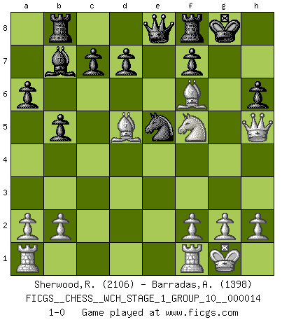 Last move : 1-0 2014 December 10 12:57:27 [Event "FICGS__CHESS__WCH_STAGE_1_GROUP_10__000014"] [Site "FICGS"] [Date "2014.11.01"] [Round "1"] [White "Sherwood,Russell"] [Black "Barradas,Anderson"] [Result "1-0"] [WhiteElo "2106"] [BlackElo "1398"] 1.e4 e5 2.Nf3 Nc6 3.Bb5 a6 4.Ba4 b5 5.Bb3 Nf6 6.O-O Bc5 7.c3 O-O 8.d4 exd4 9.cxd4 Bb6 10.e5 Ne4 11.Bd5 Nf6 12.exf6 Qxf6 13.Nc3 Bxd4 14.Nxd4 Bb7 15.Be3 Rab8 16.Ne4 Qd8 17.Bg5 Qe8 18.Nf6+ gxf6 19.Bxf6 Ne5 20.Nf5 h6 21.Qh5 1-0 Ruy Lopez : Caro variation Kingside Castling by player White (move 6) Kingside Castling by player Black (move 7) Player White won this chess game. Follow this game move after move (download)Kasparov : J'adoube , Ivanchuk : S'il vous plaît ! (Garry Kasparov & Vassily Ivanchuk, Linares 1997) Die Jungen erwarten, dass Opa einfach umfällt. Dann aber kann Opa fünf Stunden lang Schach spielen und die jungen Gegner an die Wand drücken. (Viktor Kortschnoi) Existen dos clases de sacrificios: los correctos y los mÃos. (Mikhail Tal) Le temps de noter son nom sur la feuille de partie, j'étais déjà en zeitnot ! D'un modeste amateur apparié lors de la première ronde d'un open contre le grand-maître Azmaïparashvili. Establishing goals is all right if you don't let them deprive you of interesting detours. (Doug Larson)