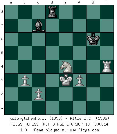 Last move : 1-0 2015 April 23 8:56:42 [Event "FICGS__CHESS__WCH_STAGE_1_GROUP_10__000014"] [Site "FICGS"] [Date "2014.11.01"] [Round "1"] [White "Kolomytchenko,Igor"] [Black "Altieri,Carlo"] [Result "1-0"] [WhiteElo "1999"] [BlackElo "1996"] 1.e4 c5 2.Nf3 d6 3.d4 cxd4 4.Nxd4 Nf6 5.Nc3 a6 6.h3 e5 7.Nb3 Be7 8.g4 Be6 9.g5 Nfd7 10.h4 Nc6 11.Be3 O-O 12.Bh3 Bxh3 13.Rxh3 a5 14.a3 b5 15.Rg3 Nb6 16.Qe2 b4 17.Bxb6 Qxb6 18.Nd5 Qb7 19.a4 Bd8 20.O-O-O Ne7 21.Kb1 Qc6 22.h5 Nxd5 23.Rxd5 g6 24.f3 Bb6 25.Rh3 Qc7 26.Qd3 Rfd8 27.Rh1 Qc6 28.hxg6 fxg6 29.Rd1 Qe8 30.Nd2 Qxa4 31.Rxd6 Bd4 32.Qc4+ Kh8 33.Rc6 Rf8 34.Rh1 Ra7 35.Rc7 h5 36.Rxa7 Bxa7 37.Qa6 Bf2 38.Qxg6 h4 39.Qh6+ Kg8 40.Qe6+ Kg7 41.Qxe5+ Kf7 42.Qf6+ Kg8 43.Qe6+ Kg7 44.g6 Qe8 45.Qd5 Qxg6 46.Qxa5 Rf7 47.e5 h3 48.e6 Qxe6 49.Qxb4 Qd7 50.Qc3+ Bd4 51.Qd3 Kf8 52.Nc4 Bf6 53.Qxd7 Rxd7 54.Rxh3 Rd4 55.Ne3 Rb4 56.Nd1 Rd4 57.Nf2 Rb4 58.b3 Kf7 59.Ne4 Rb8 60.Kc1 Be5 61.Kd2 Kg6 62.Rh4 Bc7 63.Kd3 Rd8+ 64.Ke3 1-0 Sicilian : Najdorf, Adams attack Kingside Castling by player Black (move 11) Queenside Castling by player White (move 20) 10 pieces endgame at move 53 : White KRNPPP , Black KRBP WHITE : King + 1 Rook 1 Knight 3 Pawns BLACK : King + 1 Rook 1 Bishop 1 Pawn 9 pieces endgame at move 54 : White KRNPPP , Black KRB WHITE : King + 1 Rook 1 Knight 3 Pawns BLACK : King + 1 Rook 1 Bishop Player White won this chess game. Follow this game move after move (download)When your house is on fire, you can't be bothered with the neighbors. Or, as we say in Chess, if your King is under attack you don't worry about losing a Pawn on the Queen's side. (Gary Kasparov) Schach ist das Spiel, das die Verrückten gesund hält. (Albert Einstein) Los finales de Peón son del Ajedrez lo que el cesped es del Golf. (Cecil Purdy) Toute estimation doit être constamment réévaluée. (Jacob Estrin) Tree pose grows confidence. It roots me to this world. (Terri Guillemets)