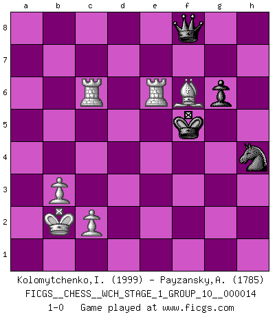 Last move : 1-0 2015 April 22 6:42:55 [Event "FICGS__CHESS__WCH_STAGE_1_GROUP_10__000014"] [Site "FICGS"] [Date "2014.11.01"] [Round "1"] [White "Kolomytchenko,Igor"] [Black "Payzansky,Aleksey"] [Result "1-0"] [WhiteElo "1999"] [BlackElo "1785"] 1.e4 c5 2.Nf3 d6 3.d4 cxd4 4.Nxd4 Nf6 5.Nc3 g6 6.Be3 Bg7 7.f3 O-O 8.Qd2 Nc6 9.g4 Be6 10.Nxe6 fxe6 11.O-O-O Ne5 12.Be2 Qc8 13.h4 Nfd7 14.f4 Nc4 15.Bxc4 Qxc4 16.e5 Rad8 17.exd6 Nb6 18.dxe7 Rxd2 19.exf8Q+ Kxf8 20.Bxd2 Bxc3 21.Bxc3 Qxf4+ 22.Kb1 Qxg4 23.Bd4 Qh5 24.Be3 Kg7 25.Rhe1 Qg4 26.Bd4+ Kh6 27.a3 Nc4 28.Bc3 b5 29.a4 a6 30.Rd3 Qxh4 31.Rxe6 Qh2 32.Rd7 Qh1+ 33.Re1 Qc6 34.R1e7 Qh1+ 35.Be1 Qc6 36.axb5 axb5 37.b3 Nd6 38.Bd2+ Kh5 39.Rxh7+ Kg4 40.Bb4 Nf5 41.Rd1 Kf3 42.Rh3+ Kg4 43.Rhd3 Kg5 44.Re1 Kf6 45.Bc3+ Kg5 46.Kb2 Kh5 47.Bd2 Qg2 48.Re5 Qb7 49.R3d5 b4 50.Rb5 Qa7 51.Bxb4 Kg4 52.Bc3 Qa6 53.Rb4+ Kh5 54.Rf4 Kg5 55.Rf2 Kh5 56.Rh2+ Kg4 57.Re1 Kg3 58.Rhe2 Qa7 59.Rf1 Qc5 60.Re6 Kg2 61.Rd1 Nh4 62.Rd2+ Kf3 63.Rd3+ Kf4 64.Rd4+ Kg5 65.Rc4 Qf8 66.Bf6+ Kf5 67.R4c6 1-0 Sicilian : Dragon, Yugoslav attack, 7...O-O Kingside Castling by player Black (move 7) Queenside Castling by player White (move 11) Promotion Queen by player White (move 19) 10 pieces endgame at move 51 : White KRRBPP , Black KQNP WHITE : King + 2 Rooks 1 Bishop 2 Pawns BLACK : King + 1 Queen 1 Knight 1 Pawn Player White won this chess game. Follow this game move after move (download)A Chess game is a dialogue, a conversation between a player and his opponent. Each move by the opponent may contain threats or be a blunder, but a player cannot defend against threats or take advantage of blunders if he does not first ask himself: What is my opponent planning after each move ? (Bruce A. Moon) Aljechin war kein Nazi. Er war ein Opportunist. Ein schrecklicher Mann. Er liebte Geld über alles und würde für Geld ein Jude, ein Katolik oder ein Protestant werden. (Miguel Najdorf) Sin errores no puede haber brillantez. (Emanuel Lasker) Votre prénom est 'Tactique', votre deuxième prénom est 'Tactique' et votre nom est 'Tactique'. (Ken Smith) The message for business people contemplating their place in the cyberspace is simple and direct: get linked or get lost. (Vic Sussman and Kenan Pollack)