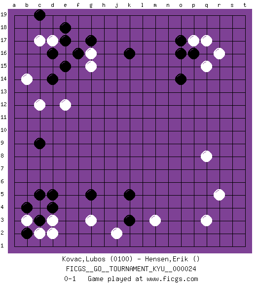 Last move : 0-1 2007 April 26 12:50:40 [Event "FICGS__GO__TOURNAMENT_KYU__000024 "] [Site "FICGS"] [Date "2007.02.25"] [Round "1"] [Black "Kovac,Lubos "] [White "Hensen,Erik "] [Result "0-1"] [Rating 1 "0100"] 1.d4 q3 2.d16 r16 3.p16 p17 4.o17 q17 5.o16 q15 6.k16 r5 7.k3 g16 8.d14 d17 9.e17 e16 10.e15 c17 11.f16 q8 12.o14 m3 13.e18 g3 14.c19 d3 15.c3 d2 16.d5 g15 17.k5 c4 18.c5 c12 19.c9 e12 20.g5 b3 21.b4 c2 22.b2 b14 23.g17 j2 0-1 This go game has been lost on time (started : 2007.02.25 18:37:12) Here are the names of the openings (joseki) played in the four corners : Corner q16 : r16 p16Komoku (Somok, Xiao~mu`) 3-4 Point. The komoku (3-4) point is the traditional corner enclosure move..Ikken Takagakari (Hankan Nop'dakeolch'im, Yi Gaogua`jiao~, 1-Space High Approach). The 5-4 approach move has become more popular in modern times, as modern Go emphasizes speed and influence. Corner d16 : d16 g16Hoshi (Hwajeom, Seongjeom, Xingwei`) 4-4 Point. The star or hoshi (4-4) point, emphasizing influence at the potential expense of territory.Nikken Takagakari (Dukan Nop'dakeolch'im, E`r Gaojia, 2-Space High Approach). White 2 is a light approach move. Rarely played in even games, White 2 is typically employed in handicap games. Black continues with 6-4 or 3-10. In Korean Sunjang Baduk Black has a stone on 8-4. Corner d4 : d4 g3Hoshi (Hwajeom, Seongjeom, Xingwei`) 4-4 Point. The star or hoshi (4-4) point, emphasizing influence at the potential expense of territory.Nikken Kakari (Dukan Keolch'im, E`r Gua`jiao~, 2-Space Low Approach). Black typically answers by 7-3 or 3-5 (which is not joseki). Player White won this Go (weiqi, baduk) game.Follow this game move after move (download ) Beware of the clumsy double contact. (Anonymous) Cactus - It is depressed cucumber. (Ilmars Cirulis)