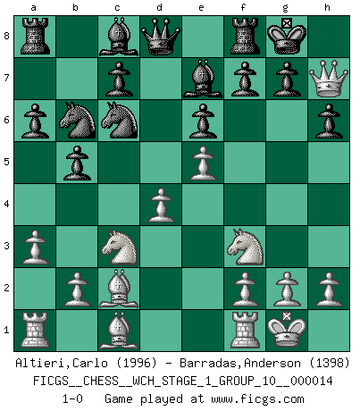 Last move : 1-0 2014 November 13 11:39:36 [Event "FICGS__CHESS__WCH_STAGE_1_GROUP_10__000014"] [Site "FICGS"] [Date "2014.11.01"] [Round "1"] [White "Altieri,Carlo"] [Black "Barradas,Anderson"] [Result "1-0"] [WhiteElo "1996"] [BlackElo "1398"] 1.c4 Nf6 2.Nc3 e6 3.Nf3 Nc6 4.d4 d5 5.a3 dxc4 6.e4 Be7 7.Bxc4 O-O 8.O-O a6 9.Bb3 b5 10.e5 Nd7 11.Bc2 h6 12.Qd3 Nb6 13.Qh7+ 1-0 English Opening Kingside Castling by player Black (move 7) Kingside Castling by player White (move 8) Player White won this chess game. Follow this game move after move (download)A thorough understanding of the typical mating continuations makes the most complicated sacrificial combinations leading up to them not only not difficult, but almost a matter of course. (Siegbert Tarrasch) Ein Schachspiel besteht aus drei Phasen: Die erste, wenn du hofftst den Vorteil zu haben, die zweite, wenn du glaubst einen Vorteil zu haben, und die dritte.... wenn du weißt Du wirst verlieren. (Savielly Grigorievitsch Tartakower) El Ajedrez es como la guerra en un tablero. (Bobby Fischer) Mais n'est-ce pas déjà le limiter injurieusement que d'appeler les échecs un jeu? N'est-ce pas aussi une science, un art, ou quelque chose qui, comme le cercueil de Mahomet entre ciel et terre, est suspendu entre l'un et l'autre, et qui réunit un nombre incroyable de contraires ? (Stefan Zweig) Hello Thibault, if I have had a plan (and I had one, I hope), I have forgotten it during the last week... - Hello Heinz-Georg. What do you mean a plan ? (Anonymous players, during a Big Chess game)