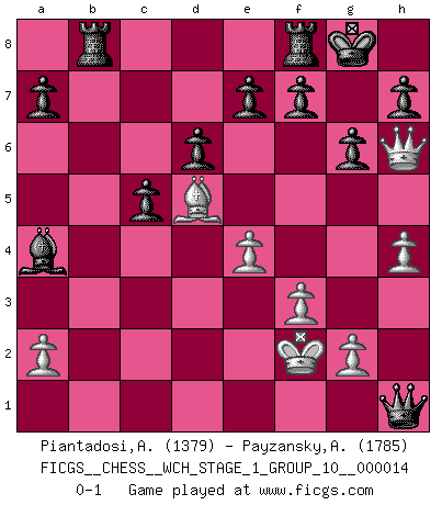 Last move : 0-1 2014 December 6 6:29:0 [Event "FICGS__CHESS__WCH_STAGE_1_GROUP_10__000014"] [Site "FICGS"] [Date "2014.11.01"] [Round "1"] [White "Piantadosi,Angelo"] [Black "Payzansky,Aleksey"] [Result "0-1"] [WhiteElo "1379"] [BlackElo "1785"] 1.e4 c5 2.Nf3 d6 3.d4 cxd4 4.Nxd4 Nf6 5.Nc3 g6 6.Be3 Bg7 7.f3 O-O 8.Bc4 Nc6 9.Qd2 Bd7 10.O-O-O Rb8 11.Nxc6 bxc6 12.Bh6 Qb6 13.Bb3 Bxh6 14.Qxh6 c5 15.Nd5 Nxd5 16.Bxd5 Qxb2+ 17.Kd2 Ba4 18.h4 Qxc2+ 19.Ke1 Qxd1+ 20.Kf2 Qxh1 0-1 Sicilian : Dragon, Yugoslav attack, 7...O-O Kingside Castling by player Black (move 7) Queenside Castling by player White (move 10) Player Black won this chess game. Follow this game move after move (download)Different people feel differently about resigning. (Bobby Fischer) Capablanka war das größte Genie der Schachgeschichte! Aber denken sie nicht er habe nichts vom Schach verstanden. Er wusste nur soviel wie er wissen musste um seine Ziele zu erreichen. (Mikhail Moiseyevich Botvinik) Del Ajedrez se ha dicho que la vida no es lo suficientemente larga para él, pero eso es culpa de la vida, no del Ajedrez. (William Ewart Napier) Psychologiquement, tu dois avoir confiance en toi même, mais cette confiance doit être basée sur des faits. (Robert Fischer) The quality of decision is like the well-timed swoop of a falcon which enables it to strike and destroy its victim. (Sun Tzu)
