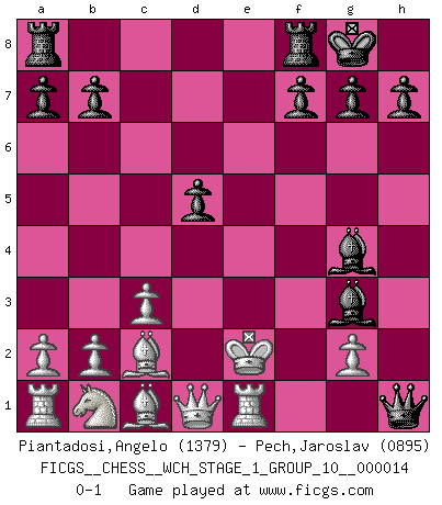Last move : 0-1 2014 December 28 17:37:41 [Event "FICGS__CHESS__WCH_STAGE_1_GROUP_10__000014"] [Site "FICGS"] [Date "2014.11.01"] [Round "1"] [White "Piantadosi,Angelo"] [Black "Pech,Jaroslav"] [Result "0-1"] [WhiteElo "1379"] [BlackElo "0895"] 1.e4 c6 2.d4 d5 3.exd5 cxd5 4.Bd3 Nc6 5.c3 Nf6 6.Ne2 e5 7.dxe5 Nxe5 8.Bc2 Bd6 9.O-O O-O 10.Re1 Nfg4 11.Ng3 Qh4 12.h3 Nxf2 13.Kxf2 Ng4+ 14.hxg4 Bxg3+ 15.Kf1 Qh1+ 16.Ke2 Bxg4+ 0-1 Caro-Kann : Exchange variation Kingside Castling by player White (move 9) Kingside Castling by player Black (move 9) Player Black won this chess game. Follow this game move after move (download)The sign of a great Master is his ability to win a won game quickly and painlessly. (Irving Chernev) Ein guter Spieler hat immer Glück. (José Raúl Capablanca) La táctica fluye a partir de una posición superior. (Bobby Fischer) À la honte des hommes, on sait que les lois du jeu sont les seules qui soient partout justes, claires, inviolables et exécutées. Pourquoi l'Indien qui a donné les règles du jeu d'échecs est-il obéi de bon gré dans toute la terre, et que les décrétales des papes, par exemple, sont aujourd'hui un objet d'horreur et de mépris ? C'est que l'inventeur des échecs combina tout avec justesse pour la satisfaction des joueurs, et que les papes, dans leurs décrétales, n'eurent en vue que leur seul avantage. L'Indien voulut exercer également l'esprit des hommes et leur donner du plaisir; les papes ont voulu abrutir l'esprit des hommes. Voltaire (Dictionnaire philosophique / Garnier 1967) God is an atheist. (Unknown)