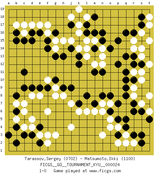 Last move : 1-0 2007 July 3 3:39:49 [Event "FICGS__GO__TOURNAMENT_KYU__000024"] [Site "FICGS"] [Date "2007.02.25"] [Round "1"] [Black "Tarassov,Sergey"] [White "Matsumoto,Ikki"] [Result "1-0"] [Rating 1 "0702"] [Rating 2 "1100"] 1.q16 d4 2.q4 d17 3.q10 r14 4.p15 r11 5.r10 s11 6.s15 r15 7.r16 s14 8.q13 q12 9.r13 s13 10.p12 s10 11.q11 r8 12.r6 q2 13.r3 n3 14.p7 j4 15.c15 c16 16.d15 f16 17.c11 c7 18.l16 k17 19.l17 g3 20.c9 o5 21.q8 r9 22.q9 s7 23.s6 f6 24.f14 h15 25.h13 d8 26.d9 l6 27.l8 j7 28.j9 n7 29.n8 k14 30.k13 l14 31.m14 l13 32.k12 m12 33.m11 m15 34.n16 n14 35.o14 n12 36.n11 k16 37.c3 c4 38.d3 e3 39.e2 f2 40.e4 f3 41.b4 b3 42.c5 d5 43.b2 b5 44.a3 e8 45.f9 h8 46.h9 s16 47.s17 t15 48.b6 c6 49.b8 b7 50.b16 b17 51.b15 r2 52.p3 p2 53.s2 q3 54.s3 p4 55.p5 o4 56.q5 o7 57.o8 g8 58.r12 t17 59.s18 t18 60.k18 j18 61.r7 t8 62.s12 t12 63.e16 e17 64.d16 c17 65.j17 l18 66.m18 k19 67.n15 n13 68.m16 l15 69.g16 g15 70.f15 f17 71.j14 j15 72.m7 g14 73.g13 m6 74.k7 k6 75.o6 n6 76.t7 t6 77.t5 g9 78.g10 f10 79.e9 1-0 This go game has been lost on time (started : 2007.02.25 18:37:12) Here are the names of the openings (joseki) played in the four corners : Corner q16 : q16 r14 Hoshi (Hwajeom, Seongjeom, Xingwei`) 4-4 Point. The star or hoshi (4-4) point, emphasizing influence at the potential expense of territory. Ikken Kakari (Hankan Keolch'im, Yi Gua`jiao~, 1-Space Low Approach). White 2 is the standard approach move to the 4-4. Corner q4 : q4 r8 Hoshi (Hwajeom, Seongjeom, Xingwei`) 4-4 Point. The star or hoshi (4-4) point, emphasizing influence at the potential expense of territory. Corner d16 : d17 c15 Komoku (Somok, Xiao~mu`) 3-4 Point. The komoku (3-4) point is the traditional corner enclosure move.. Ikken Kakari (Hankan Keolch'im, Yi Gua`jiao~, 1-Space Low Pincer). The small knight move is the basic approach move to the 3-4 point stone. It has been continually used for over four centuries. There are limitless variations, with new moves constantly being discovered. Black 2 opens the door to a treaure store of joseki. Player Black won this Go (weiqi, baduk) game. Follow this game move after move (download)When in doubt, remove the enemy stones from the board. (Bill Taylor) Rules and bones are meant to be broken. (Anonymous)