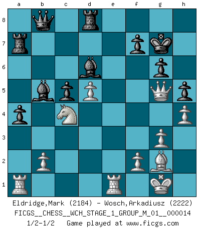 Last move : 1/2-1/2 2015 January 24 15:39:49 [Event "FICGS__CHESS__WCH_STAGE_1_GROUP_M_01__000014"] [Site "FICGS"] [Date "2014.11.01"] [Round "1"] [White "Eldridge,Mark"] [Black "Wosch,Arkadiusz"] [Result "1/2-1/2"] [WhiteElo "2184"] [BlackElo "2222"] 1.d4 Nf6 2.c4 e6 3.Nf3 d5 4.g3 Be7 5.Bg2 O-O 6.O-O dxc4 7.Qc2 a6 8.Qxc4 b5 9.Qc2 Bb7 10.Bd2 Be4 11.Qc1 Bb7 12.Bf4 Nd5 13.Nc3 Nxf4 14.Qxf4 Nd7 15.Rfd1 Bd6 16.Qe3 Nb6 17.a4 Nxa4 18.Nxa4 bxa4 19.Rxa4 Qb8 20.Qd3 g6 21.e4 c5 22.d5 exd5 23.exd5 Bc8 24.Qc3 a5 25.h4 h5 26.Re1 Bd7 27.R4a1 a4 28.Qf6 Ra7 29.Nd2 Rd8 30.Qg5 Kg7 31.Nc4 Bb5 1/2-1/2 Queen's pawn game Kingside Castling by player Black (move 5) Kingside Castling by player White (move 6) This chess game ended in a draw. Follow this game move after move (download)It was clear to me that the vulnerable point of the American Grandmaster (Bobby Fischer) was in double-edged, hanging, irrational positions, where he often failed to find a win even in a won position. (Efim Geller) Es ist wirklich schade, dass so viele Schachspieler nicht auf ihr Äußeres achten! (Alexandra Kosteniuk) Alguna parte de un error es siempre correcto. (Savielly Tartakover) Aux échecs, les retours au sommet sont rares : les dommages psychologiques consécutifs à une défaite sont trop sévères. (Daily Telegraph) Chess is everything: art, science and sport. (Anatoly Karpov)