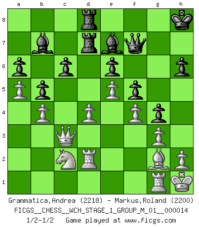 Last move : 1/2-1/2 2015 February 8 20:40:3 [Event "FICGS__CHESS__WCH_STAGE_1_GROUP_M_01__000014"] [Site "FICGS"] [Date "2014.11.01"] [Round "1"] [White "Grammatica,Andrea"] [Black "Markus,Roland"] [Result "1/2-1/2"] [WhiteElo "2218"] [BlackElo "2200"] 1.d4 d5 2.c4 e6 3.Nf3 Nf6 4.g3 c6 5.Bg2 dxc4 6.Ne5 Nbd7 7.Nxc4 Be7 8.O-O O-O 9.Nbd2 Nb6 10.e3 Qc7 11.Qe2 h6 12.b3 Nxc4 13.Nxc4 b6 14.e4 Ba6 15.Bf4 Qd7 16.Rfd1 Rac8 17.a4 Bb4 18.Bd2 Be7 19.e5 Nd5 20.a5 b5 21.Ne3 Rfd8 22.Rab1 Qe8 23.b4 Qf8 24.Qe1 Bb7 25.Rdc1 Nc7 26.Nc2 Rd7 27.Rd1 Rcd8 28.Bc3 Nd5 29.Ne3 Ba8 30.Bf1 Nxc3 31.Qxc3 f5 32.Nc2 a6 33.Bg2 Bb7 34.f4 g5 35.Kh1 Qf7 36.Rg1 Kh8 37.Rbd1 g4 38.Rd2 1/2-1/2 Queen's gambit declined Kingside Castling by player White (move 8) Kingside Castling by player Black (move 8) This chess game ended in a draw. Follow this game move after move (download)A big shock; the best chess player in history has passed away. (Lajos Portisch, about Bobby Fischer's death) Aljechin war kein Nazi. Er war ein Opportunist. Ein schrecklicher Mann. Er liebte Geld über alles und würde für Geld ein Jude, ein Katolik oder ein Protestant werden. (Miguel Najdorf) Nada excita más a Grandes Maestros aburridos que una novedad teórica. (Dominic Lawson) Karpov est une pièce de musée. (Garry Kasparov) Fame, I have already. Now I need the money. (an elderly Steinitz)
