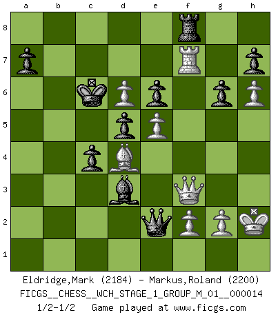 Last move : 1/2-1/2 2015 January 26 10:45:34 [Event "FICGS__CHESS__WCH_STAGE_1_GROUP_M_01__000014"] [Site "FICGS"] [Date "2014.11.01"] [Round "1"] [White "Eldridge,Mark"] [Black "Markus,Roland"] [Result "1/2-1/2"] [WhiteElo "2184"] [BlackElo "2200"] 1.e4 c6 2.d4 d5 3.e5 Bf5 4.Nf3 e6 5.Be2 c5 6.Be3 Qb6 7.Nc3 Nc6 8.O-O Qxb2 9.Qe1 c4 10.Rb1 Qxc2 11.Rxb7 Rb8 12.Rxb8+ Nxb8 13.Bd1 Qb2 14.Ba4+ Kd8 15.Bg5+ Kc8 16.Nb5 Qb4 17.Qd1 Qa5 18.Nd6+ Bxd6 19.exd6 Nf6 20.Ne5 Bg6 21.h4 Nfd7 22.Bd2 Qa6 23.h5 Nxe5 24.dxe5 Bd3 25.Re1 Kb7 26.Re3 Ka8 27.Bc3 Rf8 28.Bd4 g6 29.h6 Kb7 30.Rf3 Qa5 31.Rf6 Nc6 32.Bxc6+ Kxc6 33.Kh2 Qxa2 34.Qf3 Qe2 35.Rxf7 1/2-1/2 Caro-Kann : Advance variation Kingside Castling by player White (move 8) This chess game ended in a draw. Follow this game move after move (download)I still hope to kill Fischer. (Boris Spassky) Ich kenne keine einzige Person, die behaupten würde, Garri Kasparow sei ein guter Mensch (Nigel Short) Un jugador que es sorprendido, esta derrotado a medias. (Proverbio) Botvinnik disait en comparant les échecs à la musique: Il existe une science dont le but est l'étude de l'acoustique et des sons. Mais il y a aussi un art qui se sert de l'océan des sons : c'est la musique. De toute évidence, il en est de même pour la pensée. La logique est l'étude des lois de la réflexion et les échecs reflètent, en tant qu'art, le côté logique de la réflexion, sous la forme d'images artistiques... Extrait de Fischer - Spassky, Reykjavik 1972 par Alexander & F. Wyndham (Ed. Solar), p 37. When you stop learning you start dying. (M. Scott Adams)