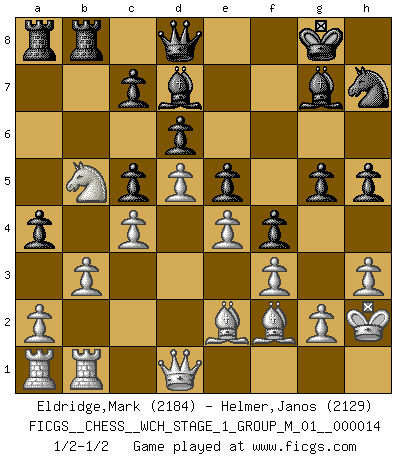 Last move : 1/2-1/2 2015 February 8 2:44:55 [Event "FICGS__CHESS__WCH_STAGE_1_GROUP_M_01__000014"] [Site "FICGS"] [Date "2014.11.30"] [Round "1"] [White "Eldridge,Mark"] [Black "Helmer,Janos"] [Result "1/2-1/2"] [WhiteElo "2184"] [BlackElo "2129"] 1.d4 Nf6 2.c4 g6 3.Nc3 Bg7 4.e4 d6 5.Nf3 O-O 6.h3 e5 7.d5 a5 8.Bg5 Na6 9.Be2 Bd7 10.Nd2 Nc5 11.O-O h6 12.Be3 Nh7 13.Nb3 b6 14.Nxc5 bxc5 15.Qd2 Qh4 16.f3 f5 17.Bd1 f4 18.Bf2 Qg5 19.Kh2 a4 20.Be2 Rfb8 21.b3 Qd8 22.Nb5 g5 23.Rfb1 h5 24.Qd1 1/2-1/2 King's Indian : 5.Nf3 Kingside Castling by player Black (move 5) Kingside Castling by player White (move 11) This chess game ended in a draw. Follow this game move after move (download)It is difficult to play against Einstein's theory --on his first loss to Fischer. (Mikhail Tal) Ich bin Weltmeister und muß mit niemandem irgend etwas diskutieren. (Viswanathan Anand) Las ideas audaces son como las piezas del Ajedrez que avanzan hacia adelante. Ellas pueden ser vencidas, pero también pueden iniciar una partida victoriosa. (Goethe) Les Echecs ne sont pas pour les âmes timides. Ils requièrent un homme entier, qui ne s'arrête pas aveuglément à ce qui a été déjà établi, mais qui tente individuellement de sonder les profondeurs du jeu. (W. Steinitz) Horse racing is animated roulette. (Roger Kahn)