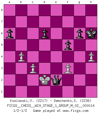 Last move : 1/2-1/2 2014 December 26 9:44:7 [Event "FICGS__CHESS__WCH_STAGE_1_GROUP_M_02__000014"] [Site "FICGS"] [Date "2014.11.01"] [Round "1"] [White "Koslowski,Volker"] [Black "Demchenko,Sergey"] [Result "1/2-1/2"] [WhiteElo "2217"] [BlackElo "2236"] 1.e4 c5 2.Nf3 d6 3.d4 cxd4 4.Nxd4 Nf6 5.Nc3 g6 6.Be3 Bg7 7.f3 O-O 8.Qd2 Nc6 9.O-O-O d5 10.exd5 Nxd5 11.Nxc6 bxc6 12.Bd4 Bxd4 13.Qxd4 Qb6 14.Na4 Qc7 15.Nc5 Rd8 16.g4 Rd6 17.Bc4 Nb6 18.Qe4 Nxc4 19.Qxc4 Be6 20.Nxe6 Rxe6 21.h4 Rd8 22.b3 Rxd1+ 23.Rxd1 Rd6 24.Qc5 Qd7 25.Rxd6 exd6 26.Qe3 c5 27.a3 Qd8 28.g5 h5 29.gxh6 Qf6 30.Kd2 Kh7 31.Qe4 Kxh6 32.c3 Kh5 33.b4 cxb4 34.Qg4+ Kh6 35.axb4 Qe5 36.Qc4 f5 37.Qf7 a6 38.Qc4 Qh2+ 39.Qe2 Qxe2+ 1/2-1/2 Sicilian : Dragon, Yugoslav attack, 7...O-O Kingside Castling by player Black (move 7) Queenside Castling by player White (move 9) This chess game ended in a draw. Follow this game move after move (download)There's never before been a Chess player with such a thorough knowledge of the intricacies of the game and such an absolutely indomitable will to win. I think Bobby is the greatest player that ever lived. (Lisa Lane) Du weisst es gibt ein Problem mit Computern und Fernschach, wenn jeder eine Rating von 2450 hat. (John Christen Knudsen) Diferente gente reacciona diferentemente en aceptar la derrota. (Bobby Fischer) Si le désir cupide (et stupide) de gagner est une inépuisable source de souffrance, une combinaison brillante sur l'échiquier est une découverte : le coquelicot qui s'épanouit lorsque apparaît la Voie Lactée. (Arrabal) It's not enough to succeed. Others must fail. (Gore Vidal)