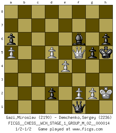 Last move : 1/2-1/2 2015 February 20 22:21:12 [Event "FICGS__CHESS__WCH_STAGE_1_GROUP_M_02__000014"] [Site "FICGS"] [Date "2014.11.01"] [Round "1"] [White "Gazi,Miroslav"] [Black "Demchenko,Sergey"] [Result "1/2-1/2"] [WhiteElo "2190"] [BlackElo "2236"] 1.d4 Nf6 2.Bg5 g6 3.c4 Bg7 4.Nc3 O-O 5.Nf3 d6 6.e3 h6 7.Bh4 c5 8.d5 g5 9.Bg3 Nh5 10.Bd3 f5 11.Nd2 Qe8 12.Be2 Nxg3 13.hxg3 Na6 14.Bh5 Qd8 15.g4 Nc7 16.Qe2 b5 17.gxf5 Bxf5 18.cxb5 Rb8 19.a4 a6 20.O-O Bd7 21.b6 Rxb6 22.Nc4 Rb4 23.Bg6 Na8 24.a5 Nc7 25.Nb6 Be5 26.Rac1 Bf5 27.Bxf5 Rxf5 28.Qd3 Rf8 29.Nc4 Bg7 30.Na2 Rb5 31.Nc3 Rb4 32.e4 Nb5 33.Rce1 Nd4 34.Ne2 Qd7 35.Nxd4 cxd4 36.b3 Qb5 37.Rb1 Rb8 38.Qh3 Rxb3 39.Qe6+ Kh7 40.Rxb3 Qxb3 41.Nb6 Qc3 42.Nd7 Rc8 43.Qxe7 d3 44.Qxd6 d2 45.Qe6 Qc1 46.Qf5+ Kh8 47.Kh2 Qxf1 48.Nf6 Bxf6 49.Qxc8+ Kg7 50.Qd7+ Kg6 51.Qf5+ Kh5 1/2-1/2 Trompowsky attack (Ruth, Opovcensky Opening) Kingside Castling by player Black (move 4) Kingside Castling by player White (move 20) This chess game ended in a draw. Follow this game move after move (download)Chess is a part of culture and if a culture is declining then Chess too will decline. (Mikhail Botvinnik) Wenn Du nicht kämpfst, um anderen etwas zu beweisen, sondern nur für Dich selbst, dann bist du fast unbesiegbar. (Garry Kasparov) Cuando tengas duda... ¡juega al Ajedrez!. (Tevis) Avec des compensations pour le matériel en plus... (Anonyme) Control your own destiny or someone else will. (Jack Welch)