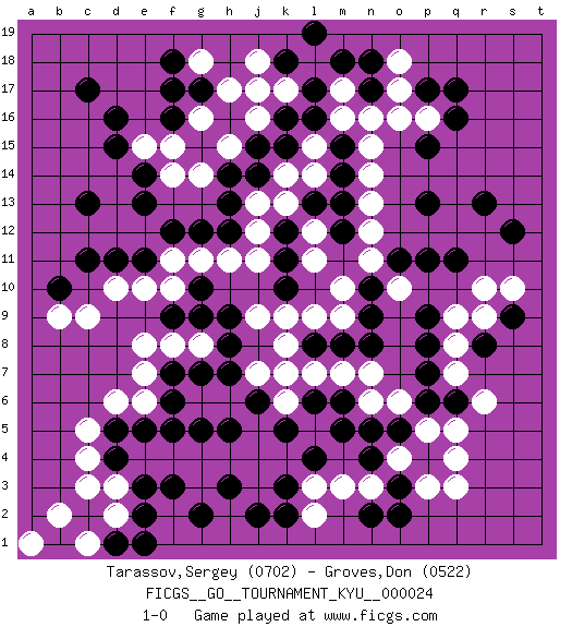 Last move : 1-0 2007 April 24 2:29:13 [Event "FICGS__GO__TOURNAMENT_KYU__000024"] [Site "FICGS"] [Date "2007.02.25"] [Round "1"] [Black "Tarassov,Sergey"] [White "Groves,Don"] [Result "1-0"] [Rating 1 "0702"] [Rating 2 "0522"] 1.q16 q3 2.d16 c4 3.k16 r6 4.e3 g3 5.e5 d6 6.g5 j4 7.j6 c9 8.c13 r10 9.r13 m3 10.k10 d2 11.e2 d3 12.d5 c5 13.d4 o17 14.p17 k17 15.l17 j17 16.g17 m17 17.l16 l18 18.n17 n16 19.n18 o18 20.m18 m16 21.k18 j16 22.m15 p16 23.p15 o16 24.q17 n15 25.m14 n14 26.m13 n13 27.p11 l15 28.k15 l14 29.l13 k14 30.j15 h15 31.j14 k13 32.k12 j13 33.h14 g14 34.h13 j12 35.h12 j11 36.k11 h11 37.g12 n11 38.g10 g11 39.f12 f11 40.e11 f10 41.g9 e10 42.d11 d10 43.c11 f8 44.n10 o10 45.o11 m10 46.n9 l12 47.m12 l11 48.p9 n12 49.r8 r9 50.s9 m9 51.n8 k9 52.h8 j9 53.l8 l9 54.q6 q5 55.p6 p5 56.m5 m7 57.m8 n6 58.n5 o6 59.o5 q7 60.p7 q8 61.p8 q9 62.q11 s10 63.s12 l7 64.k5 k8 65.f7 e6 66.f6 k6 67.k3 f4 68.d1 c1 69.c2 c3 70.b1 b2 71.f5 e4 72.f3 g4 73.g2 j3 74.j2 k4 75.l4 l3 76.k2 j5 77.h3 h4 78.h5 o4 79.c17 l2 80.p13 e7 81.f9 g8 82.g7 e8 83.h9 j18 84.l19 g16 85.f16 g18 86.f18 h17 87.f17 f15 88.e14 e15 89.d15 f14 90.e13 j7 91.h7 c1 92.e1 a1 93.b10 b9 94.l6 k7 95.m6 n7 96.n4 n3 97.p4 q4 98.o3 p3 99.o2 o4 100.n2 1-0 Here are the names of the openings (joseki) played in the four corners : Corner d4 : c4 e3 Komoku (Somok, Xiao~mu`) 3-4 Point. The komoku (3-4) point is the traditional corner enclosure move.. Ikken Kakari (Hankan Keolch'im, Yi Gua`jiao~, 1-Space Low Pincer). The small knight move is the basic approach move to the 3-4 point stone. It has been continually used for over four centuries. There are limitless variations, with new moves constantly being discovered. Black 2 opens the door to a treaure store of joseki. Player Black won this Go (weiqi, baduk) game. Follow this game move after move (download)You don't have to be really good anymore to get good results. What's happening with chess is that it's gradually losing its place as the par excellence of intellectual activity. Smart people in search of a challenging board game might try a game called Go. (Hans Berliner, The New York Times, 2003) It is not true that people stop pursuing dreams because they grow old, they grow old because they stop pursuing dreams. (Gabriel Garcia Marquez)