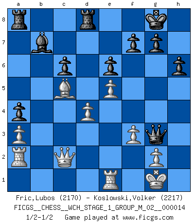 Last move : 1/2-1/2 2015 February 8 20:2:20 [Event "FICGS__CHESS__WCH_STAGE_1_GROUP_M_02__000014"] [Site "FICGS"] [Date "2014.11.01"] [Round "1"] [White "Fric,Lubos"] [Black "Koslowski,Volker"] [Result "1/2-1/2"] [WhiteElo "2170"] [BlackElo "2217"] 1.d4 d5 2.c4 c6 3.Nf3 Nf6 4.Nc3 e6 5.e3 Nbd7 6.Qc2 Bd6 7.Bd3 O-O 8.O-O dxc4 9.Bxc4 a6 10.Rd1 b5 11.Bd3 Bb7 12.Ng5 h6 13.Nge4 Bc7 14.Nxf6+ Nxf6 15.Ne4 Nxe4 16.Bxe4 Qe7 17.b3 Bd6 18.Bb2 Rac8 19.Qe2 Bxh2+ 20.Kxh2 Qh4+ 21.Kg1 Qxe4 22.f3 Qg6 23.Ba3 Rfd8 24.e4 Rd7 25.Qf2 a5 26.Bc5 a4 27.bxa4 bxa4 28.Qe2 Ra8 29.Qc2 R7d8 30.Re1 Qg5 31.a3 Qh4 32.e5 Qg5 33.Ra2 Qg3 1/2-1/2 QGD Slav : 4.Nc3 Kingside Castling by player Black (move 7) Kingside Castling by player White (move 8) This chess game ended in a draw. Follow this game move after move (download)The Pawns are the soul of the game. (Francois Andre Danican Philidor) Über Frauen: Chess is better. (Robert James Fischer) Ciertamente, de todas la drogas del mundo, el Ajedrez debe ser el mas placentero permamentemente. (Assiac) Un footballeur joue avec ses pieds, parfois avec sa tête. Un joueur d'échecs ne joue qu'avec sa tête. Et quand il ne joue plus, il meurt. (Jacob Murray) Over-the-board chess is the favorite of mortals, correspondence chess is the favorite of the gods. (Eduard Dyckhoff)