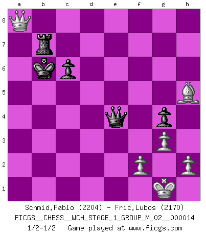 Last move : 1/2-1/2 2015 March 18 21:10:36 [Event "FICGS__CHESS__WCH_STAGE_1_GROUP_M_02__000014"] [Site "FICGS"] [Date "2014.11.01"] [Round "1"] [White "Schmid,Pablo"] [Black "Fric,Lubos"] [Result "1/2-1/2"] [WhiteElo "2204"] [BlackElo "2170"] 1.d4 Nf6 2.c4 e6 3.Nf3 d5 4.Nc3 c6 5.Bg5 h6 6.Bh4 dxc4 7.e4 g5 8.Bg3 b5 9.Be2 Bb7 10.O-O Nbd7 11.Ne5 h5 12.Nxd7 Qxd7 13.Qc1 Rg8 14.Rd1 Bb4 15.Be5 Qe7 16.a4 a6 17.d5 exd5 18.Bxf6 Qxf6 19.axb5 Bxc3 20.bxa6 Bxb2 21.axb7 Rb8 22.Ra8 Ke7 23.Qd2 c3 24.Qe3 d4 25.Rxd4 Qf4 26.Qd3 c2 27.Rd7+ Ke6 28.Qxc2 Kxd7 29.Qxb2 Kc7 30.Qa2 Rge8 31.Rxb8 Rxb8 32.g3 Qxe4 33.Qxf7+ Kb6 34.Bxh5 Rxb7 35.Qf6 g4 36.Qd8+ Ka6 37.Qa8+ Kb6 1/2-1/2 Queen's pawn game Kingside Castling by player White (move 10) This chess game ended in a draw. Follow this game move after move (download)Place the contents of the Chess box in a hat, shake them up vigorously, pour them on the board from a height of two feet, and you get the style of Steinitz. (H. E. Bird) Kann Schach nicht schließlich das Nationalspiel der Deutschen werden? Und welche weiteren Ausblicke bieten sich dann dar! Welche Hebung des allgemeinen Kultur-Niveaus, ja der Moral, wenn das Schachbrett den Kartentisch verdrängen würde! Wahrlich, ein Ziel, des Schweißes der Edlen wert! (Siegbert Tarrasch) El Ajedrez era la lengua materna de Capablanca. (Reti) Nous sommes les pions de la mystérieuse partie d'Echecs jouée par Dieu. Il nous déplace, nous arrête, nous pousse encore, puis nous lance un à un dans la boîte du Néant. Epitaphe sur la tombe de David Janowsky (1868-1927). But they are useless. They can only give you answers. (Pablo Picasso, about computers)