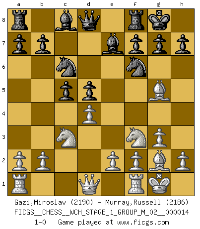 Last move : 1-0 2015 January 12 16:27:44 [Event "FICGS__CHESS__WCH_STAGE_1_GROUP_M_02__000014"] [Site "FICGS"] [Date "2014.11.01"] [Round "1"] [White "Gazi,Miroslav"] [Black "Murray,Russell"] [Result "1-0"] [WhiteElo "2190"] [BlackElo "2186"] 1.d4 d5 2.c4 e6 3.Nf3 c5 4.cxd5 exd5 5.Nc3 Nc6 6.g3 Nf6 7.Bg2 Be7 8.O-O O-O 9.Bg5 1-0 This chess game has been lost on time (started : 2014.11.01 21:33:50) Queen's gambit declined Kingside Castling by player White (move 8) Kingside Castling by player Black (move 8) Player White won this chess game. Follow this game move after move (download)All I want to do, ever, is just play Chess. (Bobby Fischer) Kritik überlasse ich den Spießern. Ich zeige nichts, wofür ich mich schämen muss. (Alexandra Kosteniuk) El Ajedrez es una manera fabulosa para que los niños aprendan a autovalorarse y a autoestimarse. (Saudin Robovic) Je crois qu'il existe des manières très spécifiques de jouer efficacement contre une machine. Evidemment, nous n'avons aucune chance en technique pure, parce que l'ordinateur calcule de manière parfaite. Mais lorsque nous faisons appel à notre cerveau, en utilisant l'intuition et la compréhension, alors nous restons beaucoup plus forts. (Anatoli Karpov) History is the quarrels of popes and kings, with wars or pestilences in every page; the men all so good for nothing, and hardly any women at all. (Jane Austen)