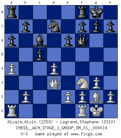 Last move : 0-1 2015 February 27 23:42:22 [Event "FICGS__CHESS__WCH_STAGE_1_GROUP_SM_01__000014"] [Site "FICGS"] [Date "2014.11.01"] [Round "1"] [White "Alcala,Alvin"] [Black "Legrand,Stephane"] [Result "0-1"] [WhiteElo "2253"] [BlackElo "2310"] 1.d4 Nf6 2.c4 e6 3.g3 d5 4.Nf3 Be7 5.Bg2 O-O 6.O-O dxc4 7.Qc2 a6 8.a4 Bd7 9.Qxc4 Bc6 10.Bg5 Bd5 11.Qd3 c5 12.Nc3 Bc6 13.Bxf6 Bxf6 14.Ne4 Nd7 15.Nxf6+ Qxf6 0-1 This chess game has been lost on time (started : 2014.11.01 21:33:53) Catalan Opening Kingside Castling by player Black (move 5) Kingside Castling by player White (move 6) Player Black won this chess game. Follow this game move after move (download)Chess makes man wiser and clear-sighted. (Vladimir Putin) Smyslow ist ein Beweis dafür, dass ich noch zehn Jahre spielen kann! [der 75 jährige über den 85 jährigen] (Viktor Kortschnoi) El Ajedrez es una guerra en un tablero. El objetivo es aplastar la mente del oponente. (Bobby Fischer) Shah mat. Le roi est mort. Cri de fierté d'un joueur venant de terrasser son adversaire, courtoisement, sans effusion de sang. Knowledge rests not upon truth alone, but upon error also. (Carl G. Jung)