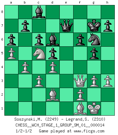 Last move : 1/2-1/2 2015 January 28 0:32:6 [Event "FICGS__CHESS__WCH_STAGE_1_GROUP_SM_01__000014"] [Site "FICGS"] [Date "2014.11.01"] [Round "1"] [White "Soszynski,Marek"] [Black "Legrand,Stephane"] [Result "1/2-1/2"] [WhiteElo "2249"] [BlackElo "2310"] 1.e4 e5 2.Nf3 Nc6 3.Bb5 Nf6 4.O-O Nxe4 5.Re1 Nd6 6.Nxe5 Be7 7.Bf1 Nf5 8.Nf3 O-O 9.d4 d5 10.c3 Bd6 11.Bd3 Re8 12.Rxe8+ Qxe8 13.Qc2 g6 14.Nbd2 Bd7 15.a4 Nce7 16.b4 Ng7 17.Qb3 Be6 18.Bb2 a6 19.Re1 c6 20.Bf1 Qd7 21.h3 f6 22.Qc2 Bf5 23.Qd1 g5 24.Nb3 Ng6 25.Nc5 Qf7 26.a5 Re8 27.Rxe8+ Nxe8 28.Bc1 Bb8 29.Nh2 Nd6 30.Qh5 Qe7 31.Ng4 Bc8 32.Be3 Nf5 33.Nh6+ Kg7 34.Nxf5+ Bxf5 35.Qf3 Bc8 36.g3 Bd6 37.Bd2 1/2-1/2 Ruy Lopez : Berlin defense, Open variation Kingside Castling by player White (move 4) Kingside Castling by player Black (move 8) This chess game ended in a draw. Follow this game move after move (download)Good offense and good defense both begin with good development. (Bruce A. Moon) Ich bin stolz ein Bulgare zu sein. (Veselin Topalov) Entre mas años cumplo, mas valoro los Peones. (Keres) On est toujours la mazette de quelqu'un d'autre. (Anonyme) I've never seen so many men wasted so badly. (Blondie in The Good, The Bad and The Ugly)