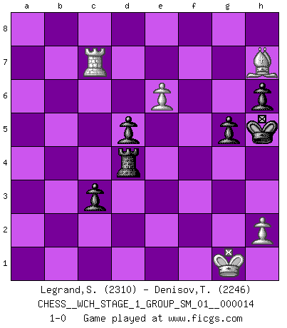 Last move : 1-0 2015 June 3 16:31:46 [Event "FICGS__CHESS__WCH_STAGE_1_GROUP_SM_01__000014"] [Site "FICGS"] [Date "2014.11.01"] [Round "1"] [White "Legrand,Stephane"] [Black "Denisov,Timofey"] [Result "1-0"] [WhiteElo "2310"] [BlackElo "2246"] 1.d4 Nf6 2.c4 g6 3.Nf3 Bg7 4.g3 O-O 5.Bg2 c6 6.Nc3 d5 7.cxd5 cxd5 8.Ne5 e6 9.O-O Nfd7 10.f4 Nc6 11.Be3 Nb6 12.Bf2 Ne7 13.Rc1 Bd7 14.b3 Bc6 15.g4 f5 16.e3 fxg4 17.Qxg4 Nf5 18.Nxc6 bxc6 19.Rc2 Rc8 20.Nb1 Bf6 21.Rfc1 Qd7 22.Bf1 a5 23.Bd3 Be7 24.Qe2 Rc7 25.Kh1 a4 26.bxa4 Nxa4 27.Nd2 Ba3 28.Rb1 Qc8 29.Nf3 Bd6 30.Ng5 h6 31.Ba6 Qd7 32.Nf3 Qf7 33.Ne5 Bxe5 34.fxe5 Ra7 35.Kg1 Ne7 36.Bd3 Kg7 37.Bg3 g5 38.Rb3 Kg8 39.Qe1 Qe8 40.Qb1 Ra8 41.Rb7 Nf5 42.Bf2 Qc8 43.Qb3 Ng7 44.Rb4 c5 45.Rxa4 c4 46.Qa3 Rxa4 47.Qxa4 Qb7 48.Bf1 Ra8 49.Rb2 Rxa4 50.Rxb7 Rxa2 51.e4 c3 52.exd5 exd5 53.Rb1 Ne6 54.Be3 Kf7 55.Bh3 Re2 56.Rb7+ Kg6 57.Bxe6 Rxe3 58.Rc7 Rd3 59.Bg8 Rxd4 60.Bh7+ Kh5 61.e6 1-0 King's Indian, 3.Nf3 Kingside Castling by player Black (move 4) Kingside Castling by player White (move 9) Player White won this chess game. Follow this game move after move (download)I don't believe in psychology. I believe in good moves. (Bobby Fischer) Über die Verhaftung Bobby Fischers: Warum es die Bush-Administration für nötig befindet einen 61 Jahre alten Mann zu hetzten, der für niemanden ausser sich selbste eine Gefahr darstellt ist ein Rätsel. (Nigel Short) Un Peón pasado aumenta su poder a medida de que el número de piezas en el tablero disminuye. (Capablanca) Les pièces de l'échiquier étaient impitoyables. Elles le retenaient, elles l'absorbaient. Il y avait de l'horreur en cela, mais aussi une harmonie unique. Car, qu'y a-t-il dans le monde, à part les échecs ? (V. Nabokov) Life is the sum of all your choices. (Albert Camus)