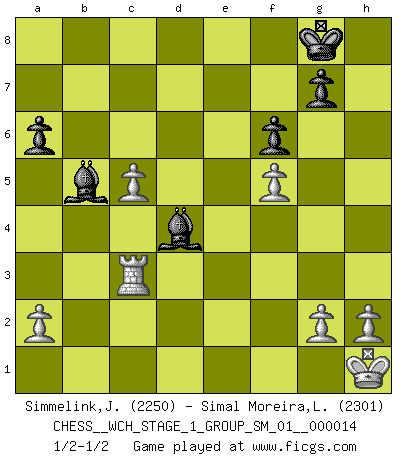 Last move : 1/2-1/2 2015 January 31 21:26:9 [Event "FICGS__CHESS__WCH_STAGE_1_GROUP_SM_01__000014"] [Site "FICGS"] [Date "2014.11.01"] [Round "1"] [White "Simmelink,Joop"] [Black "Simal Moreira,Leonardo"] [Result "1/2-1/2"] [WhiteElo "2250"] [BlackElo "2301"] 1.e4 e5 2.Nf3 Nc6 3.d4 exd4 4.Bc4 Nf6 5.e5 d5 6.Bb5 Ne4 7.Nxd4 Bd7 8.Bxc6 bxc6 9.O-O Be7 10.f3 Nc5 11.f4 O-O 12.f5 Ne4 13.Nc3 Bc5 14.Nxe4 dxe4 15.Kh1 Re8 16.b4 Bxb4 17.Bb2 Rxe5 18.Nxc6 Bxc6 19.Bxe5 Bd2 20.Bxc7 Qd5 21.Bf4 e3 22.Qe2 Bb5 23.Qf3 Qxf3 24.Rxf3 Re8 25.Rb1 Ba4 26.c4 h5 27.c5 Bc6 28.Rh3 f6 29.Rb8 Rxb8 30.Bxb8 e2 31.Bg3 Bb5 32.Rxh5 e1Q+ 33.Bxe1 Bxe1 34.Rh3 a6 35.Rb3 Bf2 36.Rc3 Bd4 1/2-1/2 Scotch gambit : Dubois-Reti defense Kingside Castling by player White (move 9) Kingside Castling by player Black (move 11) Promotion Queen by player Black (move 32) This chess game ended in a draw. Follow this game move after move (download)If a ruler does not understand Chess, how can he rule over a kingdom ? (King Khusros II) Ein Remis kann durch Wiederholung von drei Zügen oder durch einen schlechte Zug erreicht werden. (Savielly Grigorievitsch Tartakower) El Ajedrez hace al hombre ser mas sabio y ver mas claro. (Vladimir Putin) Des points faibles ou des trous dans la position de l'adversaire doivent être occupés par des pièces et non pas par des pions. (Siegbert Tarrasch) Memory... is the diary that we all carry with us. (Oscar Wilde, The Importance of Being Earnest)