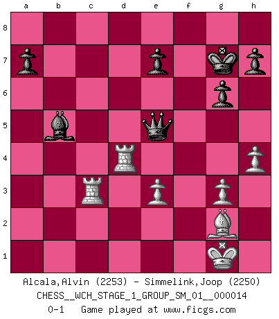 Last move : 0-1 2015 February 28 12:26:55 [Event "FICGS__CHESS__WCH_STAGE_1_GROUP_SM_01__000014"] [Site "FICGS"] [Date "2014.11.01"] [Round "1"] [White "Alcala,Alvin"] [Black "Simmelink,Joop"] [Result "0-1"] [WhiteElo "2253"] [BlackElo "2250"] 1.d4 d5 2.c4 c6 3.Nf3 Nf6 4.g3 dxc4 5.Bg2 Nbd7 6.O-O g6 7.Nc3 Bg7 8.e4 O-O 9.Qe2 b5 10.Rd1 b4 11.Nb1 Ba6 12.b3 Qc8 13.bxc4 c5 14.Nbd2 cxd4 15.Nxd4 Nb6 16.e5 Nfd5 17.Bb2 Nxc4 18.Nxc4 Bxc4 19.Qd2 Rd8 20.Rac1 Qa6 21.e6 Nc3 22.Bxc3 bxc3 23.Qxc3 Rac8 24.Qe3 Bxd4 25.exf7+ Bxf7 26.Rxc8 Bxe3 27.Rcxd8+ Kg7 28.fxe3 Qxa2 29.h4 Bc4 30.R1d4 Bb5 31.Rc8 Qe6 32.Rc3 Qe5 0-1 QGD Slav : 3.Nf3 Kingside Castling by player White (move 6) Kingside Castling by player Black (move 8) Player Black won this chess game. Follow this game move after move (download)I don't believe in psychology. I believe in good moves. (Bobby Fischer) Stil? Ich habe keinen Stil! (Anatoly Karpov) ¿Que sería del Ajedrez sin errores graciosos?. (Kurt Richter) Donnez-moi un Cavalier en 6e et je gagnerais toutes mes parties. (Steinitz) Luck never gives; it only lends. (Swedish proverb)