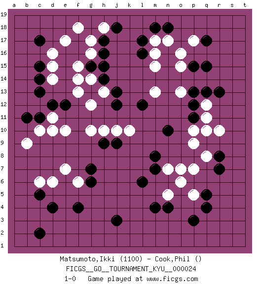 Last move : 1-0 2007 April 4 14:28:39 [Event "FICGS__GO__TOURNAMENT_KYU__000024"] [Site "FICGS"] [Date "2007.02.25"] [Round "1"] [Black "Matsumoto,Ikki"] [White "Cook,Phil"] [Result "1-0"] [Rating 1 "1100"] 1.q15 d16 2.c5 d6 3.d4 c6 4.f4 o16 5.q17 p17 6.p15 o15 7.c11 d11 8.d12 d10 9.c15 d15 10.c13 d14 11.c14 e17 12.e12 e10 13.h15 g16 14.h16 g17 15.q5 q10 16.p12 q12 17.p11 q11 18.l17 m17 19.m18 m16 20.l16 m15 21.r8 r10 22.r13 p9 23.q13 q8 24.r7 p7 25.p3 p5 26.n4 n5 27.m4 o6 28.j3 c10 29.q4 e7 30.l6 o13 31.p13 m13 32.h17 h18 33.j18 f18 34.g15 f15 35.g13 f13 36.g6 f6 37.g7 g14 38.h14 f14 39.n18 n17 40.c17 g12 41.b11 b9 42.j12 h13 43.j13 g10 44.m7 n7 45.m8 o7 46.n10 p10 47.c2 j10 48.h9 h10 49.j9 k10 50.l12 1-0 Here are the names of the openings (joseki) played in the four corners : Corner d4 : c5 d6 Mokuhazushi (Waemok, Wai`mu`) 5-3 Point. The mokuhazushi (5-3) point was popular in the Edo period in Japan (1600 - 1867). It emphasizes influence; territorially, it is inferior to the 3-4 point. Corner q16 : q15 o16 Takamoku (Gomok, Gaomu`) 5-4 Point. The takamoku (high) point (5-4). With its emphasis on influence, the 5-4 point complements the 4-4 (hoshi) point in creating an influence-oriented fuseki. Corner d16 : d16 c11 Hoshi (Hwajeom, Seongjeom, Xingwei`) 4-4 Point. The star or hoshi (4-4) point, emphasizing influence at the potential expense of territory. Player Black won this Go (weiqi, baduk) game. Follow this game move after move (download)Don't make a play adjacent to a cutting-point. (Anonymous) The hypothalamus is one of the most important parts of the brain, involved in many kinds of motivation, among other functions. The hypothalamus controls the 'Four Fs: Fighting, Fleeing, Feeding and Mating. (Unknown author)