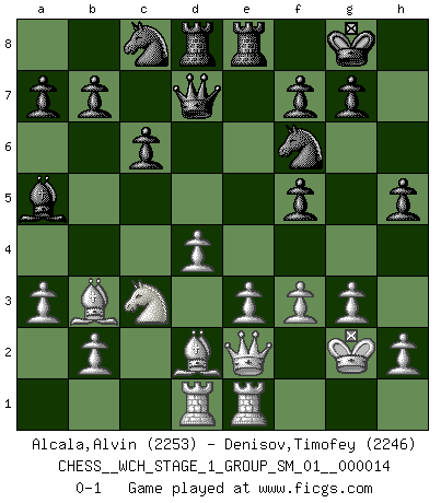 Last move : 0-1 2015 February 28 12:27:13 [Event "FICGS__CHESS__WCH_STAGE_1_GROUP_SM_01__000014"] [Site "FICGS"] [Date "2014.11.01"] [Round "1"] [White "Alcala,Alvin"] [Black "Denisov,Timofey"] [Result "0-1"] [WhiteElo "2253"] [BlackElo "2246"] 1.d4 d5 2.c4 c6 3.Nf3 Nf6 4.g3 Bf5 5.Nc3 e6 6.Nh4 dxc4 7.Nxf5 exf5 8.e3 Nbd7 9.Bxc4 Nb6 10.Bb3 Be7 11.O-O O-O 12.f3 Qd7 13.Qe2 Rfe8 14.Bd2 Rad8 15.Rad1 Bb4 16.Rfe1 h5 17.Kg2 Ba5 18.a3 Nc8 0-1 QGD Slav : 3.Nf3 Kingside Castling by player White (move 11) Kingside Castling by player Black (move 11) Player Black won this chess game. Follow this game move after move (download)When you play Bobby, it is not a question if you win or lose. It is a question if you survive. (Boris Spassky) Es gibt zwei Arten von Opfern: Korrekte und meine. (Mikhail Nekhemyevich Tal) El Ajedrez es parte de la cultura, y si una cultura esta en decadencia, entonces también el Ajedrez declinará. (Mikhail Botvinnik) Psychologiquement, tu dois avoir confiance en toi même, mais cette confiance doit être basée sur des faits. (Robert Fischer) Life doesn't imitate art, it imitates bad television. (Woody Allen)