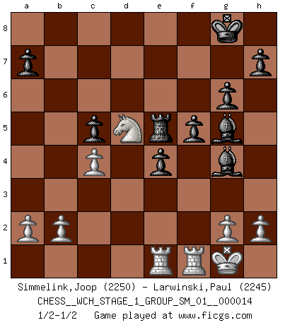 Last move : 1/2-1/2 2014 November 13 9:18:7 [Event "FICGS__CHESS__WCH_STAGE_1_GROUP_SM_01__000014"] [Site "FICGS"] [Date "2014.11.01"] [Round "1"] [White "Simmelink,Joop"] [Black "Larwinski,Paul"] [Result "1/2-1/2"] [WhiteElo "2250"] [BlackElo "2245"] 1.e4 e5 2.Nf3 Nc6 3.d4 exd4 4.Bc4 Nf6 5.e5 d5 6.Bb5 Ne4 7.Nxd4 Bd7 8.Bxc6 bxc6 9.O-O Be7 10.f3 Nc5 11.f4 O-O 12.f5 Ne4 13.Nc3 Re8 14.Nxe4 dxe4 15.Nb3 Bf8 16.Bf4 Bxf5 17.Qxd8 Raxd8 18.Bg5 g6 19.Bxd8 Rxd8 20.Rad1 Re8 21.Nd4 Bg4 22.e6 f5 23.Rde1 c5 24.Nb5 Rxe6 25.Nxc7 Re5 26.c4 Bh6 27.Nd5 Bg5 1/2-1/2 Scotch gambit : Dubois-Reti defense Kingside Castling by player White (move 9) Kingside Castling by player Black (move 11) This chess game ended in a draw. Follow this game move after move (download)Chess is as much a mystery as women. (Purdy) Schach ist mein Leben, meine Leidenschaft, was ich gelernt habe und seit meinem 14. Lebensjahr profimässig praktiziere. Darauf zu verzichten, würde mir sehr schwer fallen. (Viktor Kortschnoi) Cuando le juegas a Fischer, no es una cuestion de si vas a ganar o perder. Es una cuestion de si vas a sobrevivir. (Boris Spassky) Il vaut mieux sacrifier les pièces de l'adversaire. (Xavier Tartacover) Statistics can be made to prove anything - even the truth. (Author unknown)