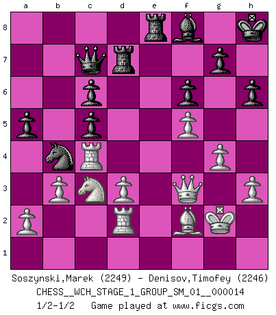 Last move : 1/2-1/2 2015 January 26 3:50:59 [Event "FICGS__CHESS__WCH_STAGE_1_GROUP_SM_01__000014"] [Site "FICGS"] [Date "2014.11.01"] [Round "1"] [White "Soszynski,Marek"] [Black "Denisov,Timofey"] [Result "1/2-1/2"] [WhiteElo "2249"] [BlackElo "2246"] 1.Nf3 Nf6 2.g3 d5 3.c4 c5 4.cxd5 Nxd5 5.Nc3 Nc6 6.Bg2 Nc7 7.O-O e5 8.d3 Be7 9.Nd2 O-O 10.Nc4 f6 11.Bxc6 bxc6 12.b3 Nd5 13.Qd2 Bh3 14.Rd1 Re8 15.Bb2 Rb8 16.Ne4 Nb4 17.f3 Be6 18.Bc3 Qd7 19.Rac1 Bf7 20.Qb2 Nd5 21.Be1 Nc7 22.g4 Ne6 23.e3 Nc7 24.Bg3 h6 25.Qf2 Bg6 26.h3 Rbd8 27.Qd2 Na6 28.f4 exf4 29.exf4 Bf7 30.f5 Bxc4 31.Rxc4 Nb4 32.Qe2 Bf8 33.Rd2 a5 34.Qd1 Kh8 35.Kh2 Qd5 36.Nc3 Qf7 37.Bf2 Qc7+ 38.Kg2 Rd7 39.Qf3 1/2-1/2 Reti Opening Kingside Castling by player White (move 7) Kingside Castling by player Black (move 9) This chess game ended in a draw. Follow this game move after move (download)Life is a kind of Chess, with struggle, competition, good and ill events. (Benjamin Franklin) Oft bringt ein stiller Zug das Erdbeben. (Richard Reti) Todo se encuentra en un estado de flujo y esto incluye al mundo del Ajedrez. (Mikhail Botvinnik) Soyez une menace à chaque fois que vous vous asseyez pour jouer. (Ken Smith) Cactus - It is depressed cucumber. (Ilmars Cirulis)