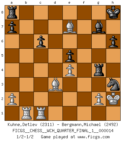Last move : 1/2-1/2 2014 December 16 8:4:18 [Event "FICGS__CHESS__WCH_QUARTER_FINAL_1__000014"] [Site "FICGS"] [Date "2014.11.01"] [Round "8"] [White "Kuhne,Detlev"] [Black "Bergmann,Michael"] [Result "1/2-1/2"] [WhiteElo "2311"] [BlackElo "2492"] 1.d4 Nf6 2.c4 g6 3.Nc3 Bg7 4.e4 d6 5.Nf3 O-O 6.Be2 e5 7.O-O Nc6 8.d5 Ne7 9.b4 Nh5 10.Re1 f5 11.Ng5 Nf6 12.f3 Kh8 13.Rb1 h6 14.Ne6 Bxe6 15.dxe6 fxe4 16.fxe4 Nc6 17.Nd5 Ng8 18.Bd3 Nd4 19.Qg4 g5 20.c5 c6 21.h4 Nf6 22.Nxf6 Qxf6 23.Be3 Qxe6 24.Qxe6 Nxe6 25.hxg5 Nxg5 26.b5 dxc5 27.bxc6 bxc6 28.Bxc5 Rf4 29.Rec1 Rg4 30.Be7 Nh3+ 31.Kh2 1/2-1/2 King's Indian : Orthodox, Aronin-Taimanov variation (Yugoslav attack / Mar del Plata variation) Kingside Castling by player Black (move 5) Kingside Castling by player White (move 7) This chess game ended in a draw. Follow this game move after move (download)When I have White, I win because I am white; When I have Black, I win because I am Bogolyubov. (Bogolyubov) Die Fehler sind da, Sie warten nur darauf gemacht zu werden. (Savielly Grigorievitsch Tartakower) Es el objetivo de la escuela moderna no tratar cada posición de acuerdo a una regla general, sino de acuerdo al principio inherente en la posición. (Richard Reti) Les Echecs sont affaire de jugement sensible. Savoir quand frapper et quand esquiver. (Fischer) If only people were all showed a certain minimum level of niceness; if only people didn't retract verbal draw offers (without draw box ticked) on ficgs; if only people didn't kill; if only people didn't run concentration / extermination camps, if only people didn't drop nuclear bombs on Hiroshima and Nagasaki, and so on - it would be a much more beautiful world. But sadly, things are not so... (Normajean Yates)