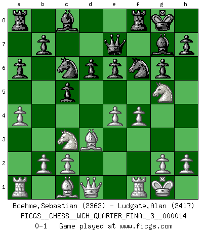 Last move : 0-1 2014 December 14 15:32:53 [Event "FICGS__CHESS__WCH_QUARTER_FINAL_3__000014"] [Site "FICGS"] [Date "2014.11.01"] [Round "8"] [White "Boehme,Sebastian"] [Black "Ludgate,Alan"] [Result "0-1"] [WhiteElo "2362"] [BlackElo "2417"] 1.d4 g6 2.e4 d6 3.f4 Bg7 4.Nf3 c5 5.d5 Nf6 6.Nc3 O-O 7.Bd3 e6 8.dxe6 fxe6 9.O-O Nc6 10.a4 a6 11.Ng5 Qe7 0-1 Modern defense Kingside Castling by player Black (move 6) Kingside Castling by player White (move 9) Player Black won this chess game. Follow this game move after move (download)The King is a fighting piece. Use it ! (Wilhelm Steinitz) Intelligenz läßt sich nicht am Weg, sondern nur am Ergebnis feststellen. (Garry Kasparov) Las piezas de Ajedrez son los bloques del alfabeto que moldean los pensamientos; y esos pensamientos, aunque hagan un diseño visual en el tablero, expresan abstractamente su belleza como un poema. (Marcel Duchamp) La tactique est l'élément le plus important du milieu de jeu. (Siegbert Tarrasch) Do you know these so called Volunteers don't even get paid! (Simpsons)