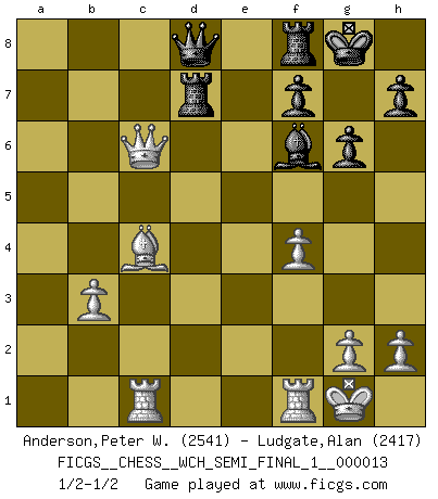 Last move : 1/2-1/2 2014 December 3 17:0:39 [Event "FICGS__CHESS__WCH_SEMI_FINAL_1__000013"] [Site "FICGS"] [Date "2014.11.01"] [Round "1"] [White "Anderson,Peter W."] [Black "Ludgate,Alan"] [Result "1/2-1/2"] [WhiteElo "2541"] [BlackElo "2417"] 1.d4 g6 2.c4 d6 3.Nc3 Bg7 4.e4 Nf6 5.f3 O-O 6.Nge2 a6 7.Be3 Nc6 8.Qd2 Rb8 9.Rc1 Bd7 10.b3 b5 11.cxb5 axb5 12.d5 Ne5 13.Nd4 Qe8 14.Be2 e6 15.a3 exd5 16.exd5 b4 17.axb4 Rxb4 18.O-O c5 19.dxc6 Nxc6 20.Nxc6 Bxc6 21.Bc4 Rb7 22.Bd4 d5 23.Bxf6 Bxf6 24.Nxd5 Bxd5 25.Qxd5 Rd7 26.Qc6 Qd8 27.f4 1/2-1/2 Modern defense Kingside Castling by player Black (move 5) Kingside Castling by player White (move 18) This chess game ended in a draw. Follow this game move after move (download)In order to improve your game, you must study the endgame before everything else, for whereas the endings can be studied and mastered by themselves, the middle game and the opening must be studied in relation to the endgame. (Jose Raul Capablanca) Über Frauen: Chess is better. (Robert James Fischer) Bobby Fischer es el mas grande genio de Ajedrez de todos los tiempos. (Alexander Kotov) Il (Jacob Murray) ne joue pas pour le bon coup, mais pour le meilleur. (Eloi Relange) A belief is an idea the mind possesses, an idea that possesses the mind. (Robert Oxden Bolton)