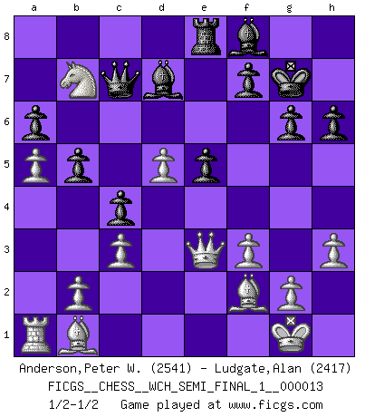 Last move : 1/2-1/2 2014 December 10 12:49:51 [Event "FICGS__CHESS__WCH_SEMI_FINAL_1__000013"] [Site "FICGS"] [Date "2014.11.01"] [Round "7"] [White "Anderson,Peter W."] [Black "Ludgate,Alan"] [Result "1/2-1/2"] [WhiteElo "2541"] [BlackElo "2417"] 1.e4 g6 2.d4 d6 3.Nc3 Bg7 4.Nf3 Nf6 5.Be2 O-O 6.O-O c6 7.a4 Nbd7 8.h3 Qc7 9.a5 e5 10.dxe5 dxe5 11.Be3 Rd8 12.Qc1 Nf8 13.Rd1 Rxd1+ 14.Qxd1 Ne6 15.Bc4 Bf8 16.Qd3 h6 17.Na4 c5 18.Nc3 Nd4 19.Nd2 Bd7 20.Nd5 Nxd5 21.exd5 Kg7 22.f3 Qb8 23.c3 Nf5 24.Bf2 b5 25.Ba2 c4 26.Qe2 Qc7 27.Ne4 Re8 28.Bb1 Nd6 29.Nc5 Nb7 30.Nxb7 a6 31.Qe3 1/2-1/2 Robatsch (Modern) defense Kingside Castling by player Black (move 5) Kingside Castling by player White (move 6) This chess game ended in a draw. Follow this game move after move (download)In Chess, as it is played by masters, chance is practically eliminated. (Emanuel Lasker) Ich bin es gewohnt, das die Jugend mir überhaupt keinen Respekt entgegenbringt. (Alexander Morozewich) ¡Examina movidas que hagan daño! Un buen ojo for movidas desvastantes es mucho mas importante que el conocimiento de principios estratégicos. (Purdy) Aux échecs, l'amour-propre est satisfait quand on remporte la victoire, mais il n'y a pas de honte à être battu. (Benjamin Franklin) Animated gif is worth one mega-word. (Unknown)