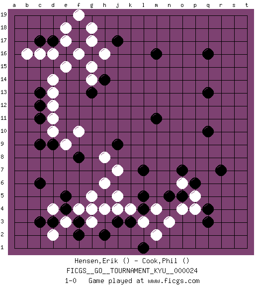 Last move : 1-0 2007 April 3 5:32:27 [Event "FICGS__GO__TOURNAMENT_KYU__000024"] [Site "FICGS"] [Date "2007.02.25"] [Round "1"] [Black "Hensen,Erik"] [White "Cook,Phil"] [Result "1-0"] 1.q16 d16 2.q4 d4 3.f3 f4 4.e4 e3 5.e5 g4 6.c13 d13 7.c12 d14 8.d17 c16 9.c17 b16 10.e16 e15 11.d3 f16 12.c6 d11 13.f17 e17 14.c9 d10 15.c11 d12 16.j17 g17 17.f18 g18 18.r7 o4 19.l4 k4 20.l5 p4 21.q3 m4 22.q13 e18 23.m16 f19 24.q10 h16 25.g13 g14 26.h14 g15 27.h5 h4 28.h2 j5 29.l7 j7 30.k3 h6 31.d9 g5 32.j9 h8 33.m11 e9 34.f8 f10 35.m3 n3 36.o5 p5 37.o7 o6 38.n5 m2 39.l1 l3 40.j3 j4 41.p6 g3 42.f2 d2 43.c3 1-0 Here are the names of the openings (joseki) played in the four corners : Corner d4 : d4 f3 Hoshi (Hwajeom, Seongjeom, Xingwei`) 4-4 Point. The star or hoshi (4-4) point, emphasizing influence at the potential expense of territory. Ikken Kakari (Hankan Keolch'im, Yi Gua`jiao~, 1-Space Low Approach). Black 2 is the standard approach move to the 4-4. Corner d16 : d16 c13 Hoshi (Hwajeom, Seongjeom, Xingwei`) 4-4 Point. The star or hoshi (4-4) point, emphasizing influence at the potential expense of territory. Nikken Kakari (Dukan Keolch'im, E`r Gua`jiao~, 2-Space Low Approach). White typically answers by 7-3 or 3-5 (which is not joseki). Player Black won this Go (weiqi, baduk) game. Follow this game move after move (download)Keshi is worth as much as an invasion ! (Anonymous) Good decisions come from experience, and experience comes from bad decisions. (Anonymous)