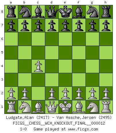Last move : 1-0 2014 November 2 12:46:7 [Event "FICGS__CHESS__WCH_KNOCKOUT_FINAL__000012"] [Site "FICGS"] [Date "2014.11.01"] [Round "2"] [White "Ludgate,Alan"] [Black "Van Assche,Jeroen"] [Result "1-0"] [WhiteElo "2417"] [BlackElo "2495"] 1.c4 1-0 English Opening Player White won this chess game. Follow this game move after move (download)A good player is always lucky. (Jose Raul Capablanca) Eine Person mit durchschnittlichem IQ kann etwa eine ELO von 2000 erreichen. (Jonathan Levitt) En el Ajedrez, tal como es jugado por los Maestros, practicamente la suerte es eliminada. (Emanuel Lasker) Les échecs sont un jeu par leur forme, un art par leur essence et une science par sa difficulté d'acquisition. Ils peuvent vous procurer autant de plaisir qu'un bon livre ou une belle musique, mais vous n'aurez une réelle joie que si vous arrivez à bien jouer. (Tigran Petrosian) When you have everything, sometimes it feels like nothing. (Horatio Caine, C.S.I. Miami)