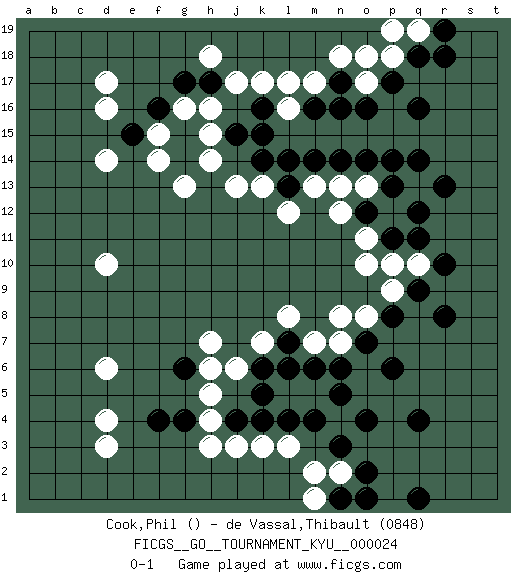 Last move : 0-1 2007 April 20 13:21:14 [Event "FICGS__GO__TOURNAMENT_KYU__000024 "] [Site "FICGS"] [Date "2007.02.25"] [Round "1"] [Black "Cook,Phil "] [White "de Vassal,Thibault "] [Result "0-1"] [Rating 2 "0848"] 1.q4 d4 2.q16 d16 3.f16 d14 4.f4 d6 5.k4 n4 6.o4 q10 7.q9 o10 8.q11 p10 9.p8 q13 10.q14 o13 11.o16 h16 12.k16 h14 13.k14 d10 14.o14 m13 15.m14 k13 16.l13 l12 17.l14 n13 18.n14 j13 19.p13 p12 20.p14 h7 21.q12 k7 22.r13 n8 23.n5 j17 24.j15 h15 25.p11 o11 26.o12 n12 27.r10 h4 28.j4 h5 29.g4 h3 30.k6 j6 31.k5 k17 32.o7 m7 33.m6 m17 34.m16 o17 35.p17 o18 36.q18 d3 37.q1 d17 38.l7 l8 39.l6 j3 40.m4 k3 41.n3 l3 42.l4 m2 43.n1 n2 44.o2 m1 45.o1 p18 46.n17 n18 47.n16 l16 48.k15 p9 49.r8 o8 50.p6 n7 51.n6 q19 52.r18 l17 53.r19 p19 54.g17 h18 55.h17 f14 56.g6 h6 57.g14 g13 58.g15 f15 59.e15 g16 0-1 Comment by player 1 : Phil Cook :any use playing on then? Comment by player 2 : Thibault de Vassal :Yes, the first one is a quote about Go :) Here are the names of the openings (joseki) played in the four corners : Corner d16 : d16 f16Hoshi (Hwajeom, Seongjeom, Xingwei`) 4-4 Point. The star or hoshi (4-4) point, emphasizing influence at the potential expense of territory.Ikken Takagakari (Hankan Nop'dakeolch'im, Yi Gaojia, 1-Space High Approach). White typically responds at 6-4 or 3-10. White 4-10 is played when White finds play on the right side advantageous. White 4-8 or 3-8 may be played when White has support at top. Corner d4 : d4 f4Hoshi (Hwajeom, Seongjeom, Xingwei`) 4-4 Point. The star or hoshi (4-4) point, emphasizing influence at the potential expense of territory.Ikken Takagakari (Hankan Nop'dakeolch'im, Yi Gaojia, 1-Space High Approach). White typically responds at 6-4 or 3-10. White 4-10 is played when White finds play on the right side advantageous. White 4-8 or 3-8 may be played when White has support at top. Corner q4 : q4 n4Hoshi (Hwajeom, Seongjeom, Xingwei`) 4-4 Point. The star or hoshi (4-4) point, emphasizing influence at the potential expense of territory.Nikken Takagakari (Dukan Nop'dakeolch'im, E`r Gaojia, 2-Space High Approach). White 2 is a light approach move. Rarely played in even games, White 2 is typically employed in handicap games. Black continues with 6-4 or 3-10. In Korean Sunjang Baduk Black has a stone on 8-4. Player White won this Go (weiqi, baduk) game.Follow this game move after move (download ) Error is one of the sources of transformation. (Pierre Audouard) Once you start thinking you have nothing left to learn, you have everything to learn. (Steve Badget)