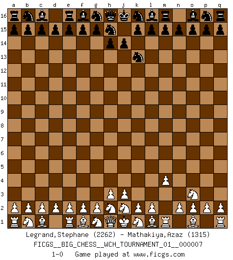Last move : 1-0 2014 November 3 18:15:18 [Event "FICGS__BIG_CHESS__WCH_TOURNAMENT_01__000007"] [Site "FICGS"] [Date "2014.11.01"] [Round "1"] [White "Legrand,Stephane"] [Black "Mathakiya,Azaz"] [Result "1-0"] [WhiteElo "2262"] [BlackElo "1315"] 1.m2-m4 j15-k13 2.p1-o3 1-0 Follow this game move after move (download)Chess is like life. (Boris Spassky) Ja, ich habe einmal eine Blitzpartie gespielt, es war in einem Zug, 1929. --im Interview 1989 (Mikhail Moiseyevich Botvinik) La estratégia requiere pensar, la táctica requiere observación. (Max Euwe) Les échecs, c'est l'art d'analyser. (Mikhail Botvinnik) Memory is a way of holding onto the things you love, the things you are, the things you never want to lose. (from the television show: The Wonder Years)