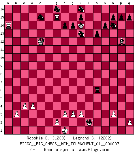 Last move : 0-1 2015 April 2 5:15:53 [Event "FICGS__BIG_CHESS__WCH_TOURNAMENT_01__000007"] [Site "FICGS"] [Date "2014.11.01"] [Round "1"] [White "Ropokis,Dimitrios"] [Black "Legrand,Stephane"] [Result "0-1"] [WhiteElo "1239"] [BlackElo "2262"] 1.j2-k4 p16-o14 2.p1-o3 m15-m13 3.h2-g4 b16-c14 4.b1-c3 e15-e13 5.g1-f3 f16-b12 6.h1-l4 j15-k13 7.k1-l3 l16-o13 8.d2-d3 n15-n14 9.e2-e4 d15-d14 10.c1-h6 b12-h6 11.g4-h6 h16-o10 12.m2-m4 o10-f2 13.e1-e2 f2-b6 14.b2-b3 b6-h6 15.l3-j4 h6-g7 16.d3-d4 g7-c7 17.f3-e5 c7-c3 18.a1-d1 c3-c7 19.l1-o4 c16-k9 20.l4-g8 k9-e4 21.o4-g11 c7-a7 22.n2-n4 e16-e14 23.o1-j6 e14-g14 24.g8-d8 g14-g12 25.j6-l8 e4-k9 26.g11-l15 k9-l8 27.d8-l8 g12-l12 28.l8-d15 k13-l15 29.d15-f15 a16-f16 30.f15-c15 l12-f12 31.e5-f3 a7-b8 32.j1-j2 f12-f15 33.c15-d14 b8-p8 34.k2-k3 p8-p2 35.o3-n5 p2-n4 36.o2-o3 n4-q7 37.c2-c4 o13-p12 38.j4-g5 o16-e7 39.d14-d7 f15-f7 40.g5-f7 f16-f7 41.d7-g10 f7-g7 42.g10-d13 h15-f14 43.d13-b11 g7-j7 44.e2-e7 j7-e7 45.b11-b15 c14-e15 46.b15-a15 e7-a7 47.a15-l5 a7-a2 48.d1-d2 a2-d2 49.f3-d2 l15-k13 50.l5-e5 e13-e12 51.f1-d3 m16-l16 52.j2-k2 l16-l12 53.m1-a1 q7-j7 54.a1-a14 j7-d2 55.d3-e4 q16-l16 56.q1-a1 d2-l9 57.a1-a9 l9-l3 58.k2-j2 l3-m4 59.n5-l6 m4-o2 60.e4-a8 l12-l6 61.a8-e12 f14-e12 62.e5-e12 j16-j15 63.k4-l6 o2-l2 64.j2-h1 l16-l6 65.a9-g9 l6-m6 66.g9-g15 j15-k14 0-1 This big chess game has been lost on time (started : 2014.11.01 23:6:27) Follow this game move after move (download)On the chessboard, lies and hypocrisy do not survive long. (Emanuel Lasker) Wer mein Gambit spielt, muß bereit sein, alle Brücken hinter sich abzubrechen. Es verändert den ganzen Menschen. Es wirkt wie ein Zauberstab und fördert verkümmerte, gute Charakter- eigenschaften wieder zu Tage. (Emil Joseph Diemer) No solamente yo pronostico su triunfo sobre Botvinnik, sino que me adelanto y digo que probablemente Fischer es el jugador de Ajedrez mas grande que haya existido. (John Collins) Les échecs sont un jeu par leur forme, un art par leur essence et une science par sa difficulté d'acquisition. Ils peuvent vous procurer autant de plaisir qu'un bon livre ou une belle musique, mais vous n'aurez une réelle joie que si vous arrivez à bien jouer. (Tigran Petrosian) You think that education is too expensive ? Try ignorance. (Derek Bok)