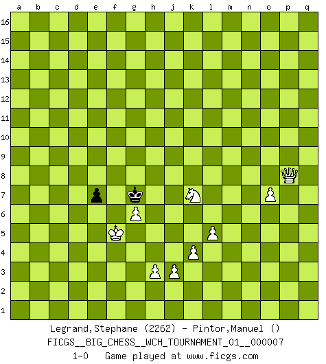 Last move : 1-0 2015 March 18 20:8:19 [Event "FICGS__BIG_CHESS__WCH_TOURNAMENT_01__000007"] [Site "FICGS"] [Date "2014.11.01"] [Round "1"] [White "Legrand,Stephane"] [Black "Pintor,Manuel"] [Result "1-0"] [WhiteElo "2262"] [BlackElo ""] 1.m2-m4 m15-m13 2.e2-e4 j15-k13 3.p1-o3 g15-g13 4.b1-c3 l16-p12 5.j2-k4 p16-o14 6.l1-o4 e15-e13 7.n2-n3 k16-l14 8.f1-b5 h16-l13 9.d2-d3 o14-n12 10.h1-o7 h14-h13 11.c1-k8 o15-o13 12.m1-m3 f16-b12 13.g1-j2 l13-f8 14.j2-h4 f15-f14 15.h2-g4 p15-p14 16.m3-l3 n15-n13 17.l3-l5 l14-m12 18.k1-h2 o16-g9 19.l5-f5 f8-g7 20.o7-m5 b16-c14 21.b5-g10 k13-j11 22.g10-c14 d15-c14 23.k8-h6 p12-k7 24.h6-g7 k7-m5 25.g7-b12 m5-j8 26.f5-f9 g9-b4 27.a2-a3 j8-g10 28.f9-f5 b4-g9 29.e1-e3 c16-k9 30.f5-d5 b15-b13 31.e3-f3 a15-a13 32.b12-e9 h13-h12 33.e9-f8 g9-f8 34.f3-f8 a16-d16 35.f8-d8 d16-d8 36.d5-d8 j16-j15 37.a1-e1 g16-h14 38.o1-g8 l15-l14 39.d8-d6 e16-d16 40.d6-q6 d16-d8 41.g8-b3 m16-d16 42.e1-e3 d8-d6 43.e3-f3 d6-q6 44.o4-q6 d16-d6 45.f3-f6 q16-d16 46.j1-j2 d6-f6 47.g4-f6 d16-d6 48.e4-e5 d6-d8 49.q2-q4 h14-j12 50.q1-e1 d8-p8 51.o3-n1 m12-l10 52.e1-e3 j12-k10 53.e3-g3 k10-l8 54.h4-j6 l8-m6 55.q6-o4 m6-n4 56.o2-o3 n4-p3 57.g3-g8 p8-g8 58.f6-g8 p3-o5 59.j6-h8 o5-q4 60.g8-j9 k9-j8 61.h8-g10 j11-g10 62.j9-l10 j8-l10 63.b3-j10 c14-c13 64.o4-k8 c13-c12 65.c3-d5 b13-b12 66.k8-j7 c12-c11 67.d5-e7 l10-h7 68.h2-j4 n12-l11 69.j10-h9 g10-j11 70.h9-n4 h7-k9 71.p2-p4 k9-l10 72.e7-f9 q4-p6 73.f9-e11 l10-f15 74.e11-d13 l11-k9 75.j7-a15 p6-n7 76.d13-c15 f15-m9 77.c15-d13 m9-d1 78.c2-c3 d1-e2 79.d3-d4 e2-f1 80.g2-g3 k9-l7 81.a15-b14 a13-a12 82.d13-b12 l7-k5 83.b12-a10 k5-m6 84.n4-c14 m6-l4 85.k2-k3 l4-n3 86.m4-m5 n3-o1 87.c14-a12 n7-p6 88.a12-b13 o1-p3 89.a10-c11 p6-o4 90.j4-l3 o4-q3 91.b14-n3 p3-q1 92.l3-n4 f1-d3 93.b13-o1 q1-o2 94.n4-o2 q3-o2 95.n3-o2 j11-h9 96.a3-a4 h9-g7 97.o2-h8 g7-e6 98.h8-n13 e6-g5 99.n13-m12 k15-k14 100.o1-f9 l14-l13 101.m12-n11 g5-f7 102.f9-g8 f7-d8 103.g8-m13 d8-c6 104.m13-p16 q15-q13 105.n11-o12 c6-a5 106.b2-b4 a5-c4 107.p16-o15 c4-b2 108.a4-a5 b2-d1 109.o15-p14 q13-q12 110.a5-a6 d1-c3 111.a6-a7 c3-b5 112.a7-a8 b5-d4 113.a8-a9 d4-c6 114.a9-a10 c6-e5 115.a10-a11 d3-h7 116.a11-a12 e5-d3 117.b4-b5 d3-f2 118.k4-h5 f2-e4 119.j2-h2 e4-d6 120.h5-k6 h7-c12 121.b5-b6 d6-c8 122.b6-b7 c8-a9 123.b7-b8 a9-c10 124.b8-b9 c10-a11 125.p14-o13 c12-d11 126.b9-b10 a11-c12 127.b10-b11 c12-b10 128.o12-p13 d11-c10 129.a12-a13 c10-b11 130.a13-a14 b10-a12 131.p13-j7 a12-c11 132.a14-a15 b11-d13 133.n1-m3 c11-b13 134.m3-k4 f14-f13 135.k4-l6 e13-e12 136.k6-l8 f13-f12 137.j7-c13 h15-f14 138.o13-k9 d13-c14 139.l8-m10 e12-e11 140.k9-m7 f14-e12 141.c13-b14 e12-c11 142.m7-d15 b13-a15 143.d15-c14 a15-c14 144.b14-c13 c11-d9 145.l6-n7 g13-g12 146.m10-o11 q12-q11 147.n7-m9 f12-f11 148.m9-o10 e11-e10 149.o10-q11 l13-l12 150.p4-p5 c14-e13 151.p5-p6 e13-g14 152.p6-p7 g14-j13 153.o3-o4 j13-l14 154.o4-o5 l14-n15 155.g3-g4 n15-o13 156.h2-g3 d9-f8 157.k3-k4 f8-h7 158.l2-l4 h7-k8 159.o11-n9 k14-k13 160.q11-o10 h12-h11 161.c13-d14 k8-h7 162.l4-l5 o13-p11 163.n9-l10 p11-n10 164.l10-j11 j15-k14 165.j11-g12 k14-l13 166.g12-f10 l13-m12 167.f10-h11 m12-n11 168.o10-n8 l12-l11 169.d14-c13 h7-k8 170.c13-j7 n11-o11 171.j7-k8 n10-m8 172.k8-g11 m8-o7 173.h11-g13 o7-q6 174.o5-o6 q6-p4 175.g13-f11 o11-n10 176.f11-h12 n10-n9 177.o6-o7 p4-q6 178.n8-m6 q6-p4 179.h12-j14 p4-n3 180.j14-h12 k13-k12 181.h12-j10 k12-k11 182.j10-l11 n3-m5 183.l11-k9 n9-m9 184.k9-l7 m5-l7 185.g11-l7 k11-k10 186.p7-p8 e10-e9 187.g3-f4 e9-e8 188.f4-f5 k10-k9 189.g4-g5 m9-l9 190.p8-p9 k9-k8 191.l7-k8 l9-k8 192.p9-p10 k8-j7 193.p10-p11 j7-j6 194.p11-p12 j6-h7 195.p12-p13 e8-e7 196.p13-p14 h7-g7 197.p14-p15 g7-f7 198.p15-p16Q f7-g7 199.p16-p8 g7-f7 200.g5-g6 f7-g7 201.m6-k7 1-0 Follow this game move after move (download)No one ever won a game by resigning. (Unknown) Ich bin Weltmeister und muß mit niemandem irgend etwas diskutieren. (Viswanathan Anand) A través de las casillas del tablero, los Indios explican el movimiento del tiempo y la edad, las influencias mas altas que controlan el mundo y los lazos que vinculan al Ajedrez con el alma humana. (Al-Masudi) Les sacrifices démontrent seulement que quelqu'un a gaffé. (Savielly Tartacover) When the going gets tactical, the computers get going. (Hyatt)