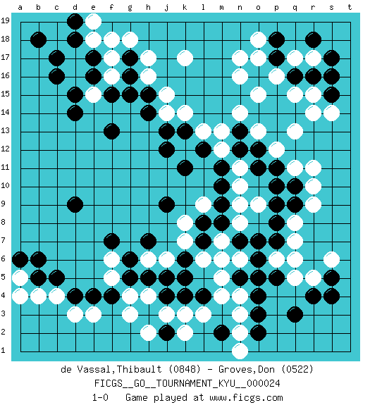 Last move : 1-0 2007 May 4 21:53:53 [Event "FICGS__GO__TOURNAMENT_KYU__000024"] [Site "FICGS"] [Date "2007.02.25"] [Round "1"] [Black "de Vassal,Thibault"] [White "Groves,Don"] [Result "1-0"] [Rating 1 "0848"] [Rating 2 "0522"] 1.q16 c4 2.q3 d17 3.d15 f16 4.c17 d16 5.c16 e15 6.d14 k17 7.e4 e3 8.d4 d3 9.c5 b4 10.f4 q5 11.o4 q8 12.q10 r14 13.s15 r11 14.d9 o17 15.p17 r10 16.q9 r9 17.o16 n17 18.p8 q7 19.p7 q11 20.p11 n16 21.k11 o15 22.n12 o13 23.o11 p12 24.f13 k3 25.h3 n3 26.r4 r5 27.s5 s6 28.s4 p6 29.o6 o5 30.n5 n6 31.p5 q6 32.n7 m6 33.o2 n2 34.l7 m7 35.m8 l6 36.l8 m4 37.l4 n4 38.k4 l3 39.j2 k2 40.m2 n1 41.o3 m5 42.o5 j3 43.j4 h2 44.k6 g3 45.b5 a5 46.a6 a4 47.b6 h4 48.h5 g4 49.g5 j14 50.j12 r17 51.r16 q17 52.p18 p16 53.s17 q15 54.d18 e18 55.d19 e19 56.b18 o18 57.r18 j6 58.j5 k7 59.k5 k8 60.j9 n8 61.o7 l9 62.m9 n9 63.m10 n10 64.m11 n11 65.o12 m12 66.l12 m13 67.e17 f17 68.e16 g18 69.n13 n14 70.p9 q13 71.f15 l13 72.g15 h16 73.h15 j15 74.k13 k14 75.j13 o9 76.p10 r15 77.s16 s14 78.g16 h17 79.g17 f18 80.h14 h6 81.g6 f6 82.h7 f5 83.f7 1-0 Here are the names of the openings (joseki) played in the four corners : Corner d16 : d17 d15 Komoku (Somok, Xiao~mu`) 3-4 Point. The komoku (3-4) point is the traditional corner enclosure move.. Ikken Takagakari (Hankan Nop'dakeolch'im, Yi Gaogua`jiao~, 1-Space High Approach). The 5-4 approach move has become more popular in modern times, as modern Go emphasizes speed and influence. Corner d4 : c4 e4 Komoku (Somok, Xiao~mu`) 3-4 Point. The komoku (3-4) point is the traditional corner enclosure move.. Ikken Takagakari (Hankan Nop'dakeolch'im, Yi Gaogua`jiao~, 1-Space High Approach). The 5-4 approach move has become more popular in modern times, as modern Go emphasizes speed and influence. Corner q4 : q3 q5 Komoku (Somok, Xiao~mu`) 3-4 Point. The komoku (3-4) point is the traditional corner enclosure move.. Ikken Takagakari (Hankan Nop'dakeolch'im, Yi Gaogua`jiao~, 1-Space High Approach). The 5-4 approach move has become more popular in modern times, as modern Go emphasizes speed and influence. Corner q16 : q16 r14 Hoshi (Hwajeom, Seongjeom, Xingwei`) 4-4 Point. The star or hoshi (4-4) point, emphasizing influence at the potential expense of territory. Ikken Kakari (Hankan Keolch'im, Yi Gua`jiao~, 1-Space Low Approach). White 2 is the standard approach move to the 4-4. Player Black won this Go (weiqi, baduk) game. Follow this game move after move (download)On the second line six die, eight live. (Anonymous) Man is reluctant to give credit for intelligence to anyone, except his enemies. (Albert Einstein)